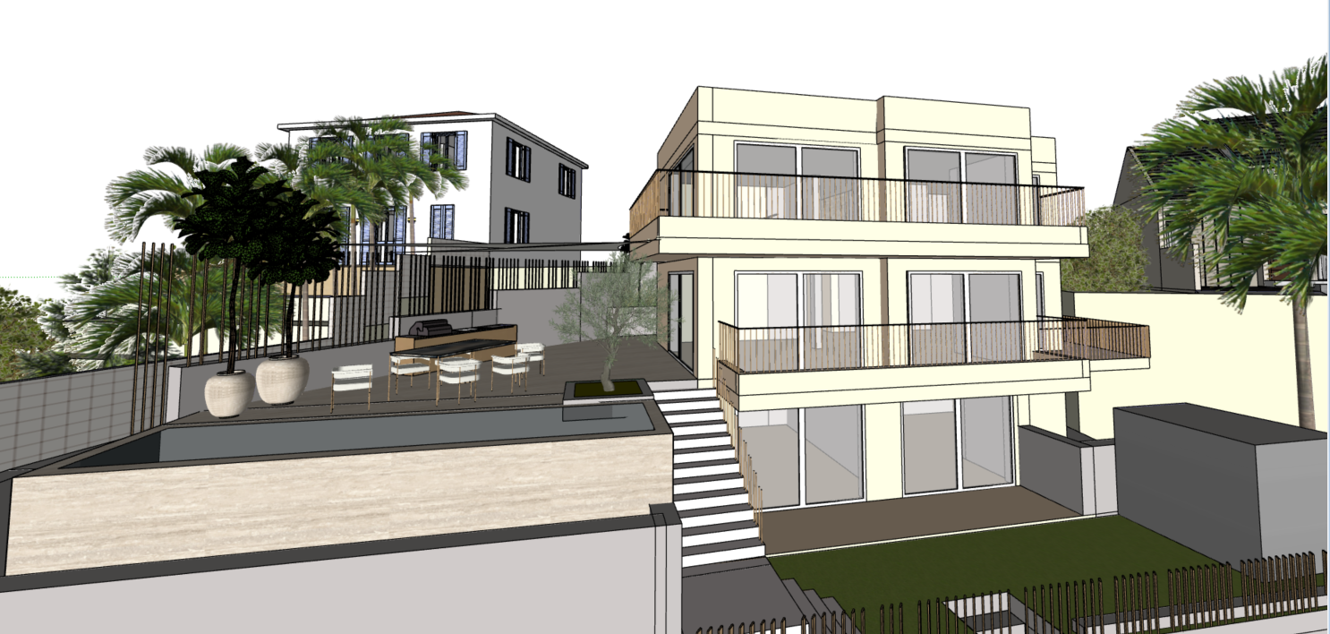 the main bulding is in shell pink color without any pattern floor is in light white cream marble color location is bra croatia and in the back there is house and trees
