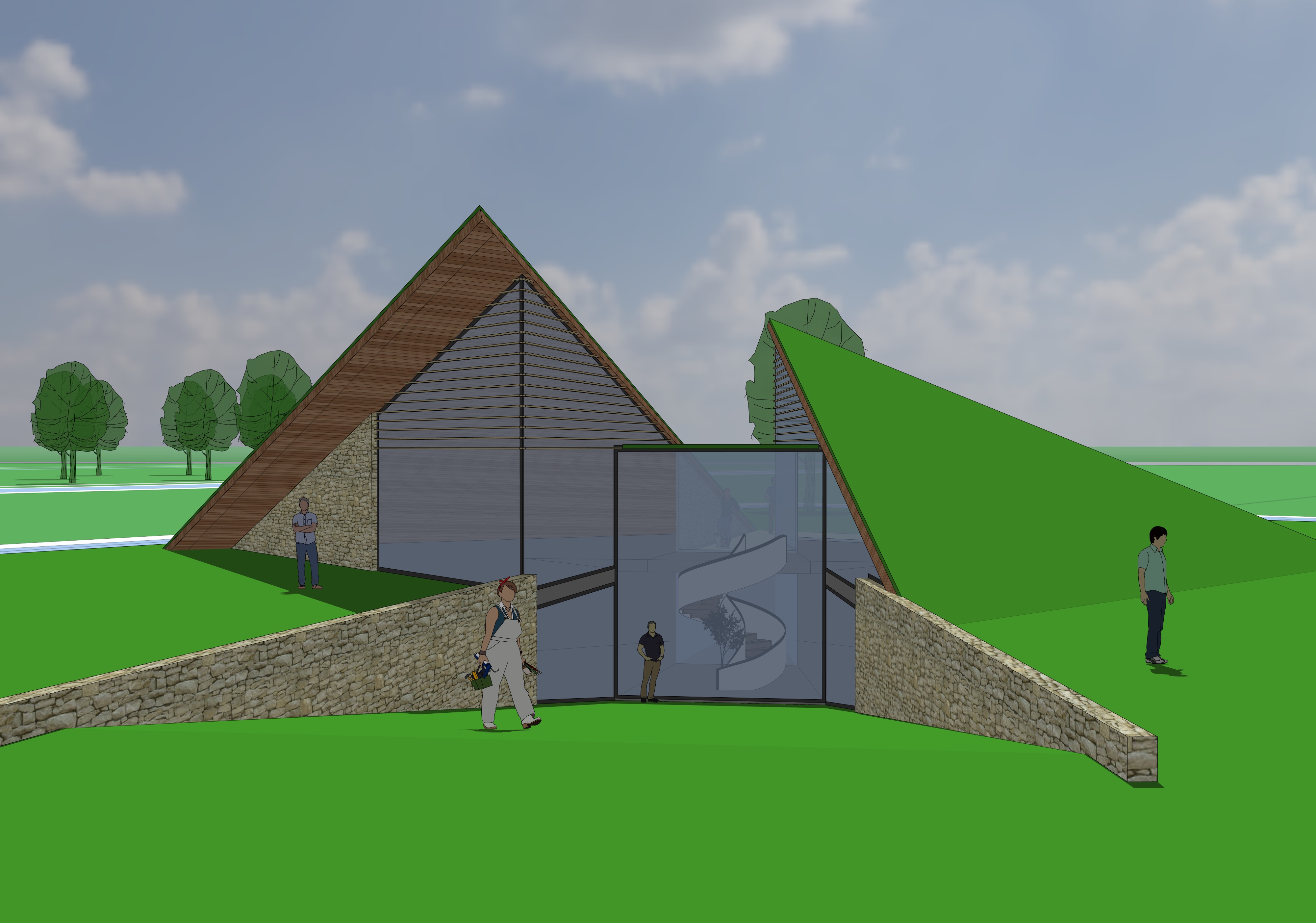 this is a modern ecological villa in a lush green garden with lots of trees bushes and flowers there is a terrace in front of the big window with garden furniture and plants