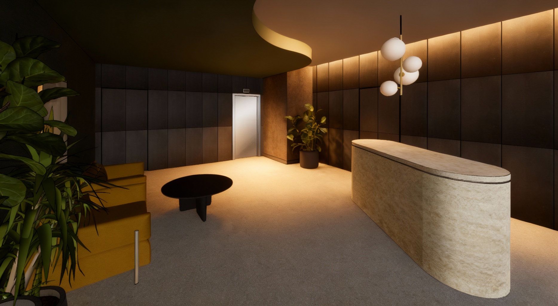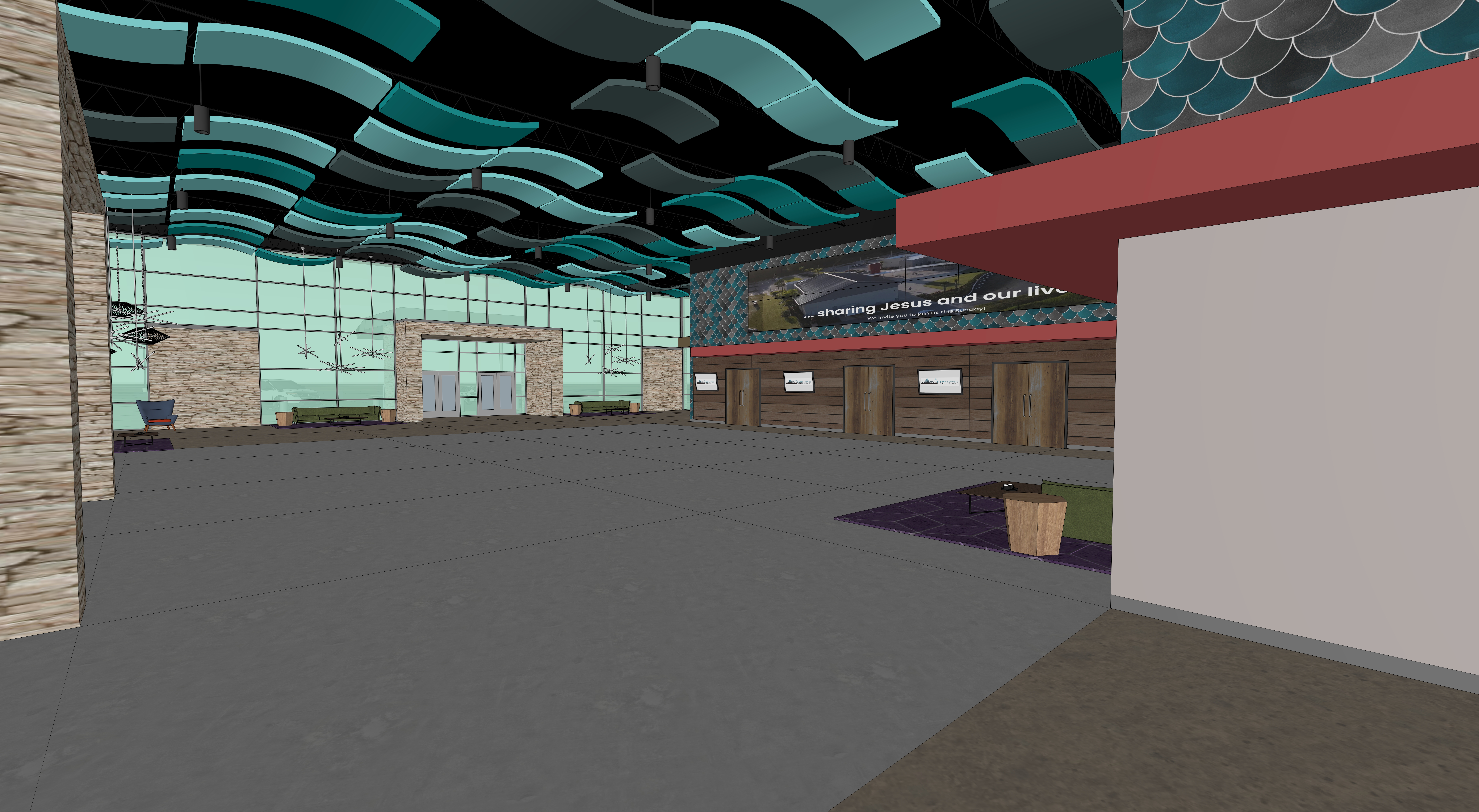 render slightly grainy modern add 10 people of different ages and races spread around the room walking in different directions wearing clothes appropriate for a casual sunday church service in florida give the grey concrete floor a slight sheen position the sun the left of the image so that it fills the room with bright afternoon light the words on the screen above the door should read sharing jesus and our lives