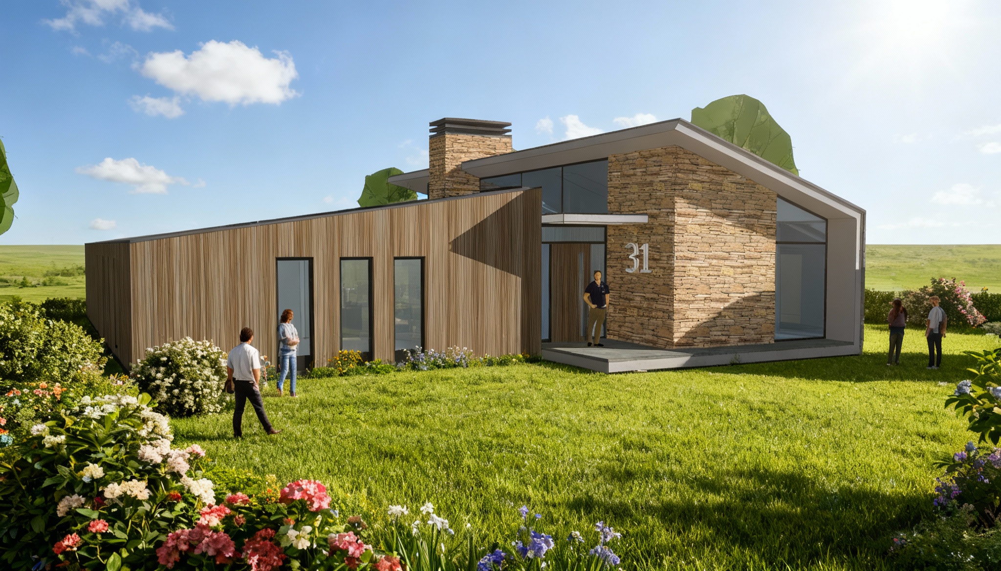 the house in the scene is surrounded by a lush green garden with lots of flowers and bushes there are lots of people in the scene the weather is sunny with a few clouds in the sky