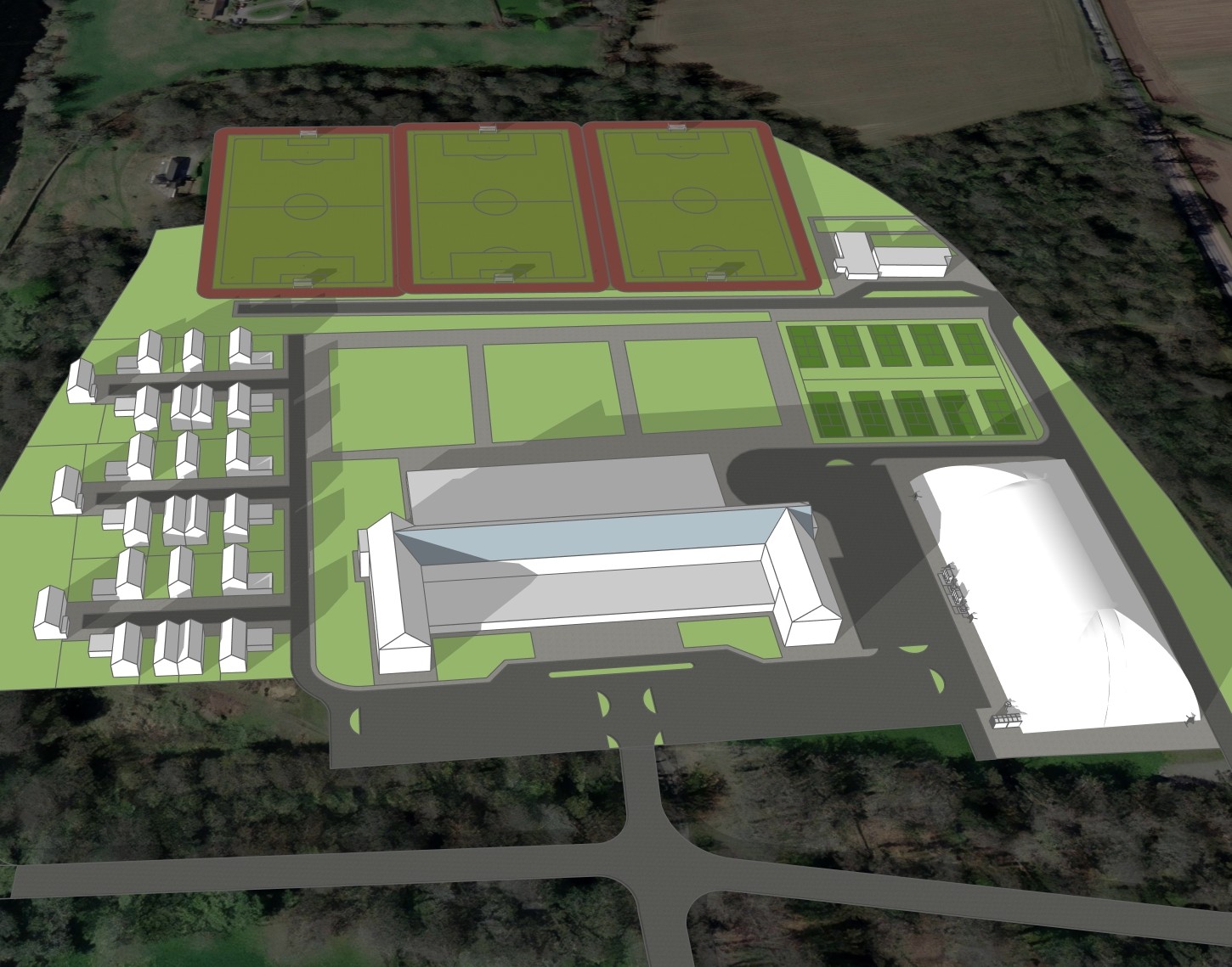 create a stunning aerial rendering of a modern sports facility complex surrounded by a lush green forest the atmosphere is vibrant and inviting the main hotel building features sleek white architecture with blue tinted glass include three green soccer fields each surrounded by a red running track displaying clear white markings the smaller courts are in a darker green shade the houses are white with gray roofs the roads are a smooth dark gray the surrounding landscape is a vivid deep green with shadows casting a tranquil effect the entire scene is bathed in the warm glow of a late afternoon sun highlighting the contours and giving it an inviting and lively ambiance