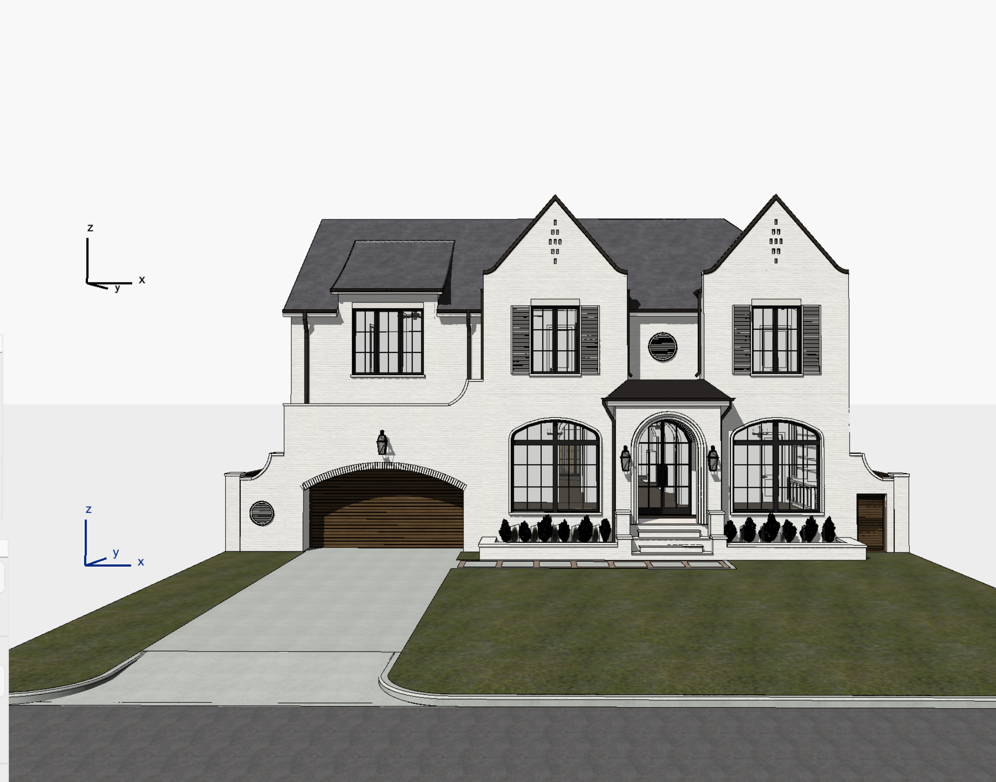 a beautiful elegant two story house with a classic design the facade is a refined off white with subtle texture complemented by a stylish gray shingle roof large symmetrical windows with black frames adding sophistication the driveway is a smooth light gray concrete bordered by meticulously maintained green lawns on either side the wooden garage doors have a rich dark brown finish for plants along the front lush vibrant greenery with well manicured bushes the atmosphere is serene and inviting with soft ambient evening lighting that gently highlights the architectural features