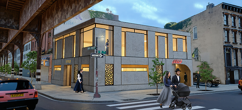 contemporary two story corner building with textured concrete fa ade bronze lattice panels and large glowing glass windows warm interior lighting evening urban street under elevated train tracks photorealistic architectural render