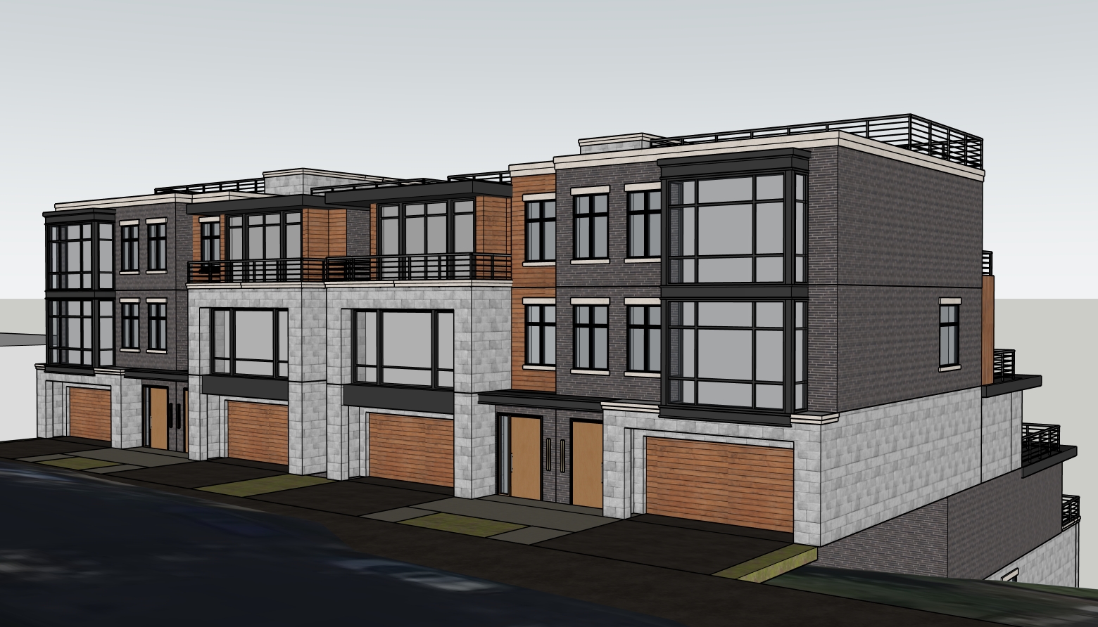 daytime bulding on top of hill overlooking cininnati ohio fully lit and rendered interiors road with driveways connecting garage in foreground