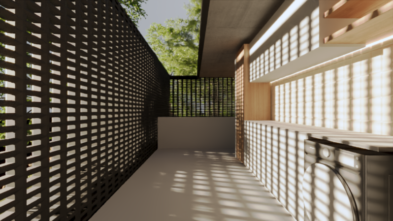 modern architectural facade with sleek minimalist design featuring a grid pattern of black lattice panels the upper section is adorned with lush green and white vegetation the building s smooth gray concrete walls create a cool elegant atmosphere large amber tinted windows reflect soft golden sunlight surrounding the structure vibrant greenery and tall slender cactus plants enhance the natural ambiance the overall atmosphere is serene and sophisticated set against a clear blue sky