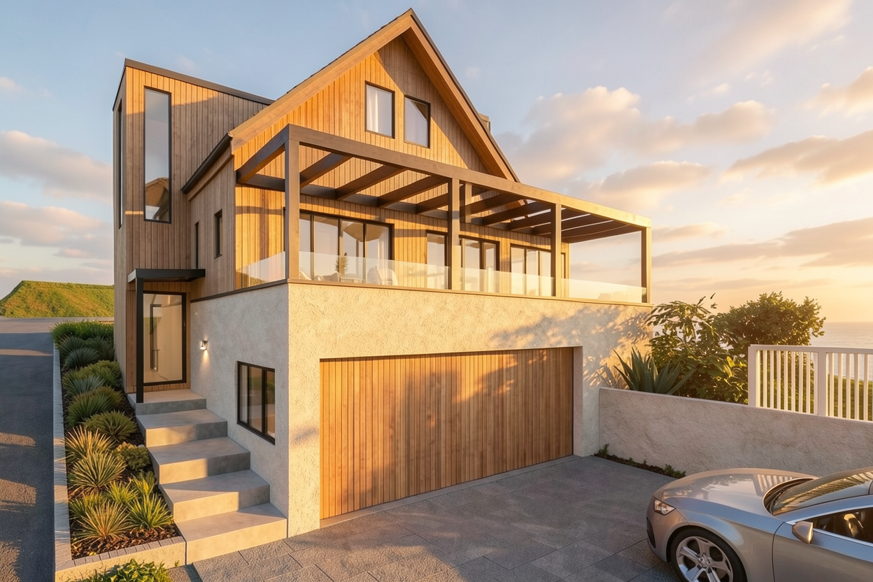black standing seam roof white board and batten siding on front wall garage wall has white limestone ledger stone ceard eaves smooth stucco on side walls