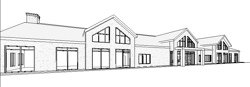 clubhouse vice beige cast stone building black standing seam roof wide glass opening