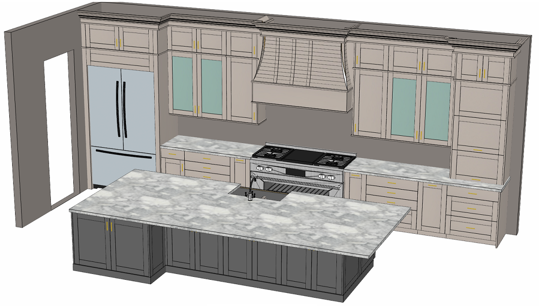do not change the cabinets in any way preserve the exact cabinet colors materials finishes dimensions door and drawer styles hardware spacing alignment and all geometry exactly as shown do not alter the countertop shape backsplash appliances flooring lighting fixtures or wall structure only remove the construction materials clutter and mess from the scene clean the room and make it look finished and staged add a few simple tasteful home accessories appropriate for the style of the space but do not add or remove any furniture windows or architectural elements maintain the original lighting direction and realism enhance clarity and polish the photo while keeping the cabinetry and room design completely unchanged do not alter the lighting to keep the cabinet colors as they are in the image keep the white background just make it look realistic remove the lines on the arched part of the hood the hood needs to match the cabinets on that wall keep everything else the exact same