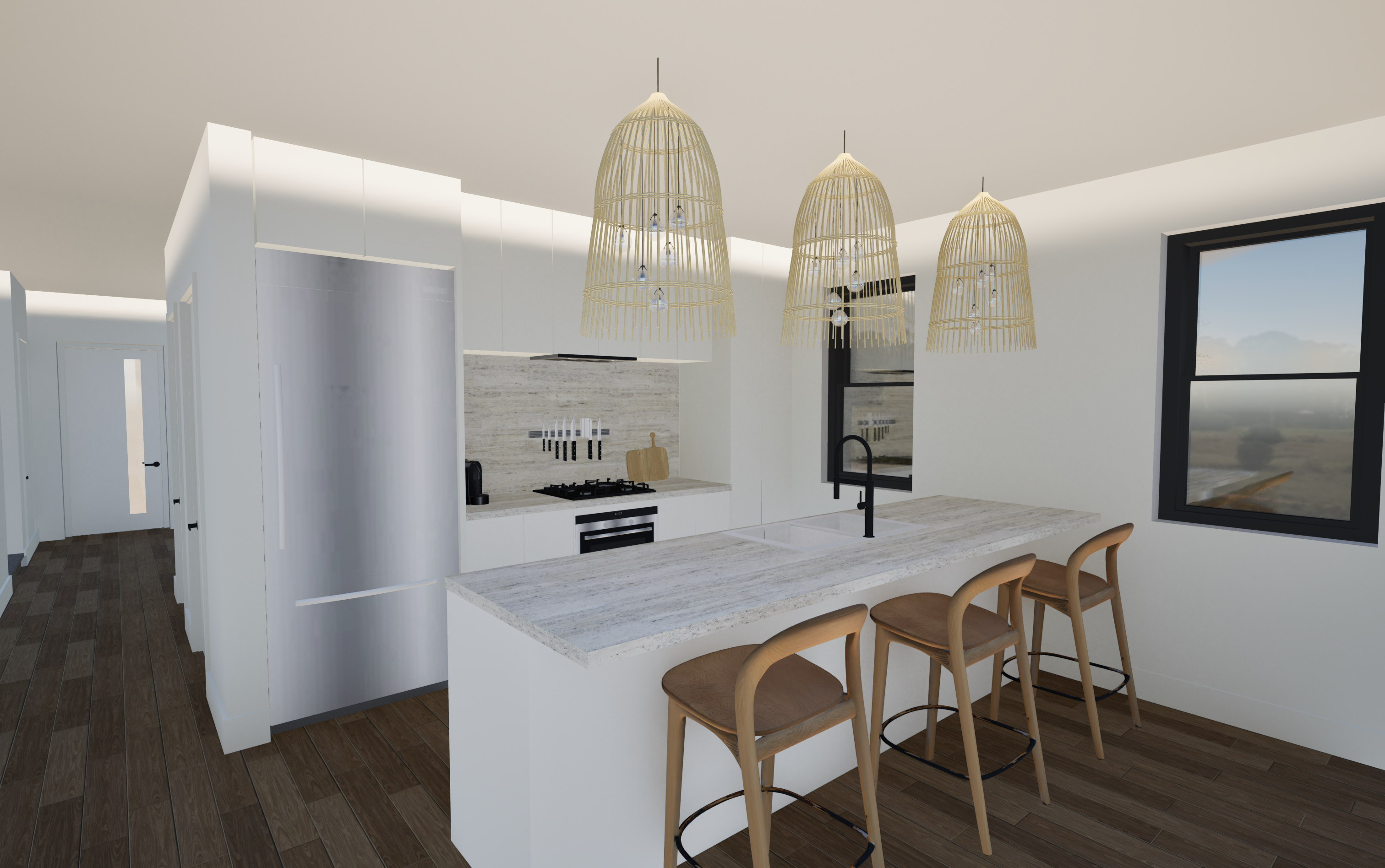 add subtle ceiling skirting cornices around the top of the walls and make the view outside clearer