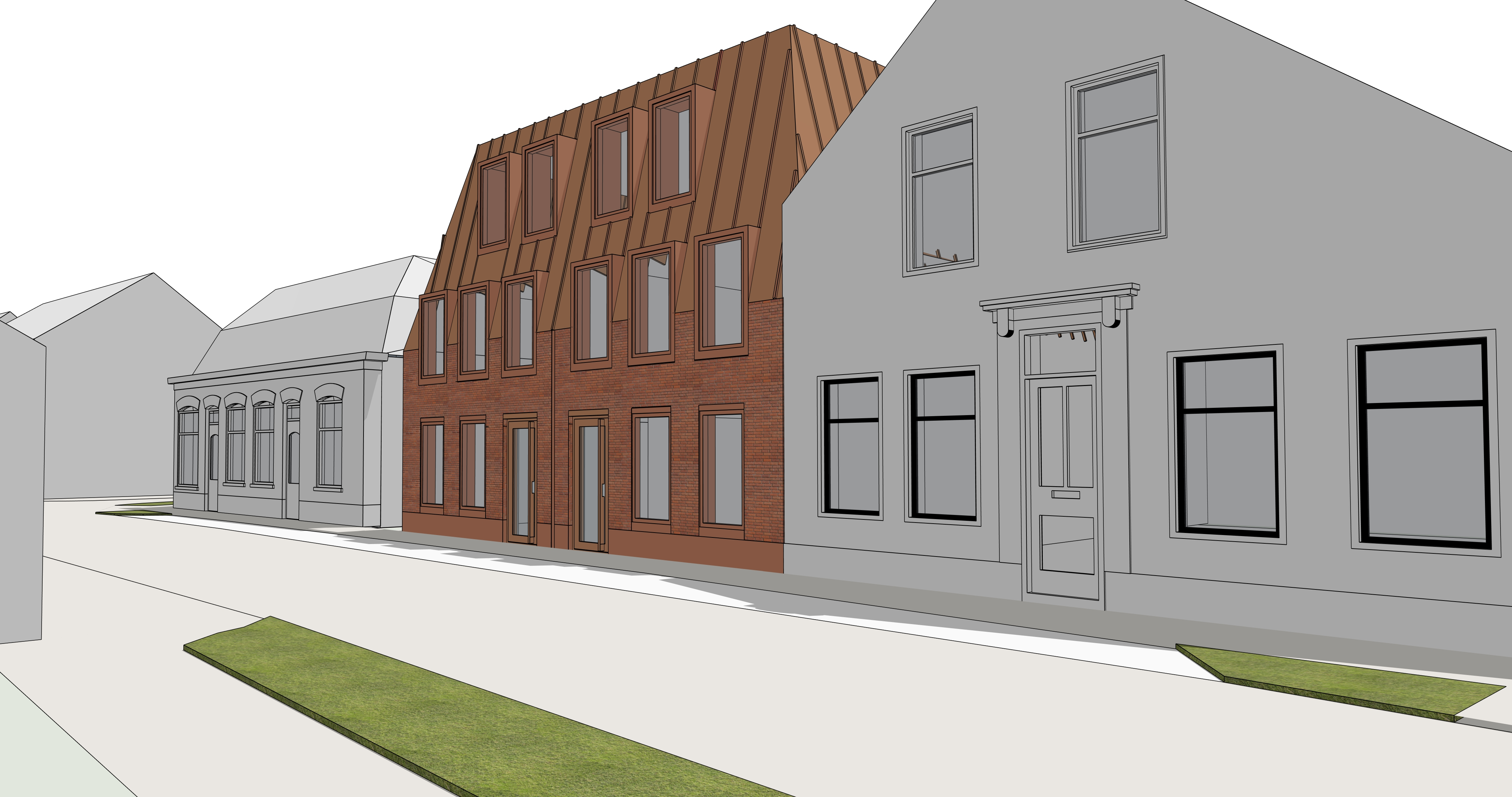 create a warm and inviting residential courtyard scene inspired by contemporary dutch architecture the main buildings should feature fa ades made of red brown mottled brick and window frames in an orange red brown tone the roof detailing must consist of vertical panels in a red brown color with a matte weathered texture adjacent buildings should be white to create contrast within the neighborhood depict an autumn like day in the netherlands with soft slightly diffused daylight and gentle warm tones in the right side of the scene include a green tree with early autumn foliage in front of the buildings add a pedestrian sidewalk and use traditional dutch style brick pavers for the street surface include subtle landscaping and a few people walking or cycling to create a calm community oriented atmosphere