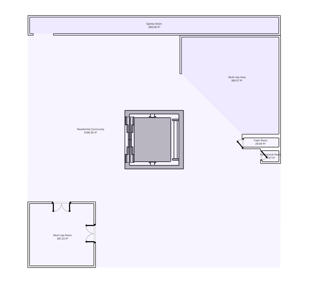convert this floor plan into a realistic isometric 3d view of a full house show the space from an elevated angle with furniture walls and details visible furnish this as a community space for an apartment complex a elevator in the center of the room and a set of egress stairs on the far wall according to the room tags strictly stick to the room tags in the image furnish the multipurpose rooms with community type games and activities like a game room or craft area put mechanical things in the mechanical room trash in the trash room make the furniture cube in shape and have a color scheme of cmy add colored glass around the area in the same color scheme to reflect color around the space stick to white and cream materials for the walls and floors stick with the layout strictly the area without walls is open for people to move freely through use the same furniture as shows on the plan do not change the orientation of the floorplan