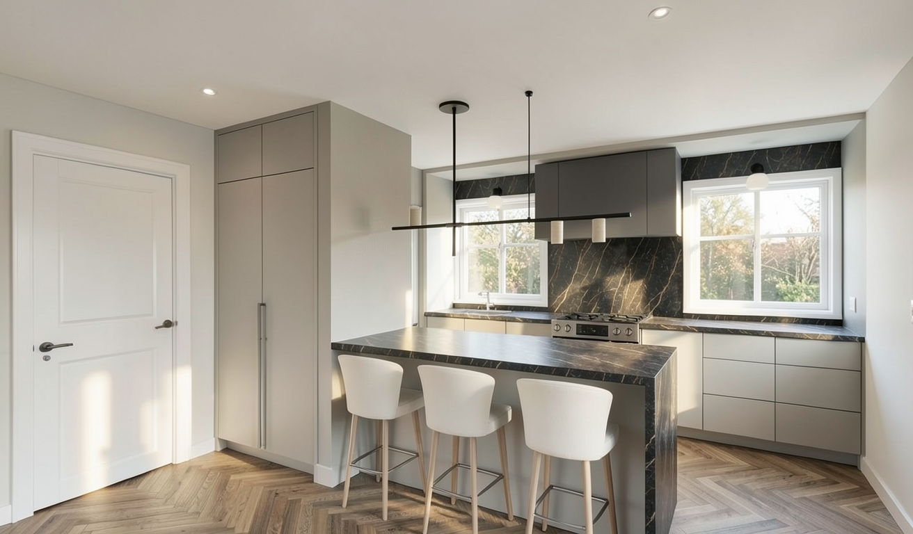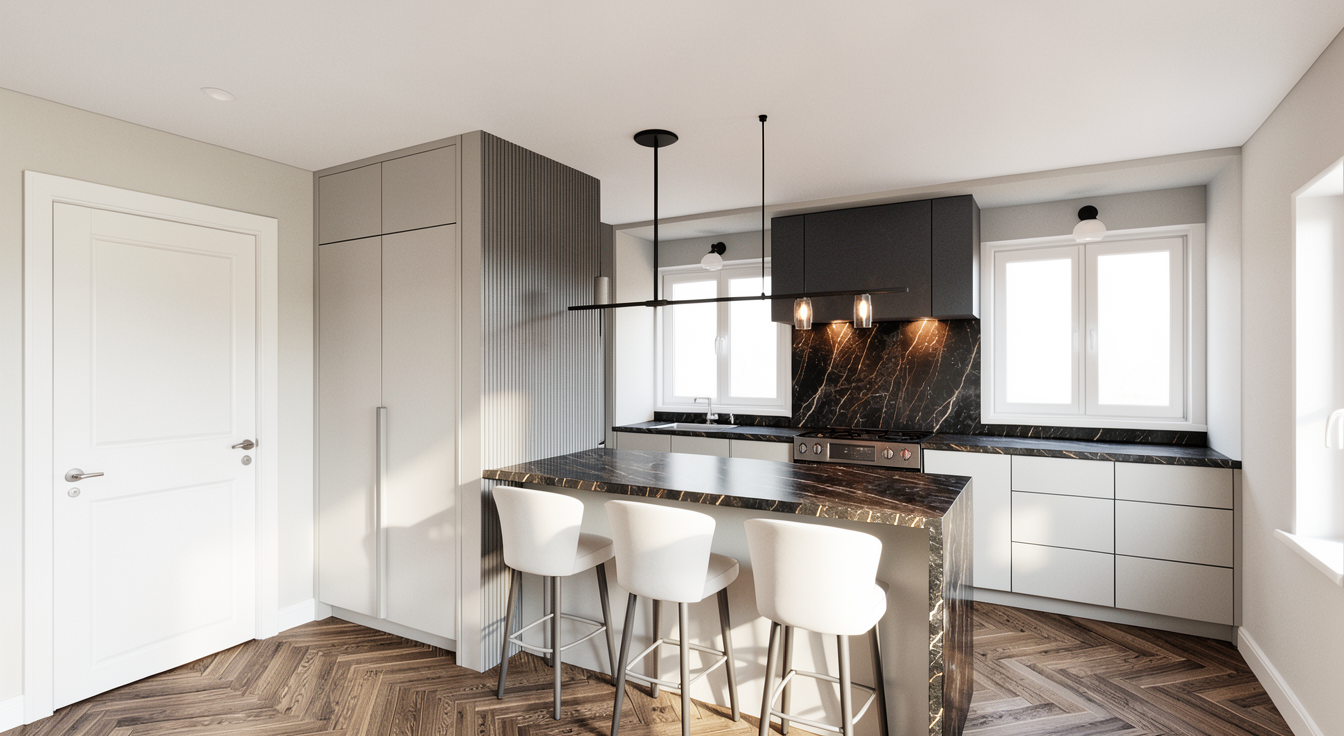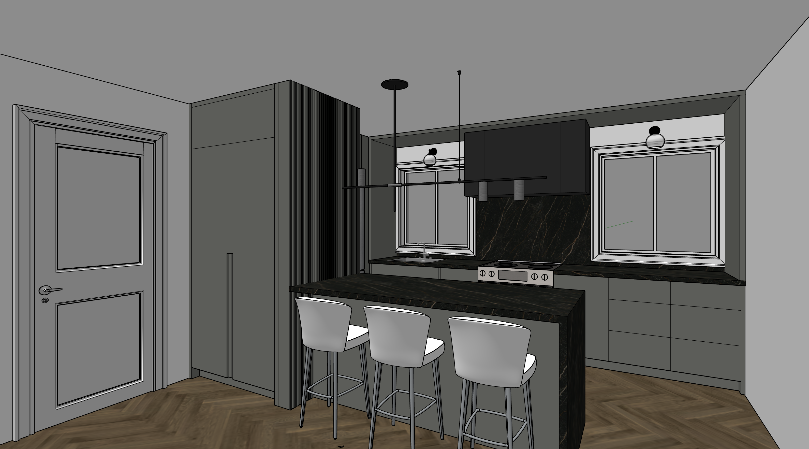 use warm grey earth tones for the wooden herringbone floors to create a cozy atmosphere incorporate dark marble countertops in the kitchen for a sleek elegant look cabinet colour is green grey use soft white tones for the walls to give a neutral yet sophisticated backdrop the kitchen and living area should have ample natural light to enhance the welcoming vibe all doors are white solid door no glass