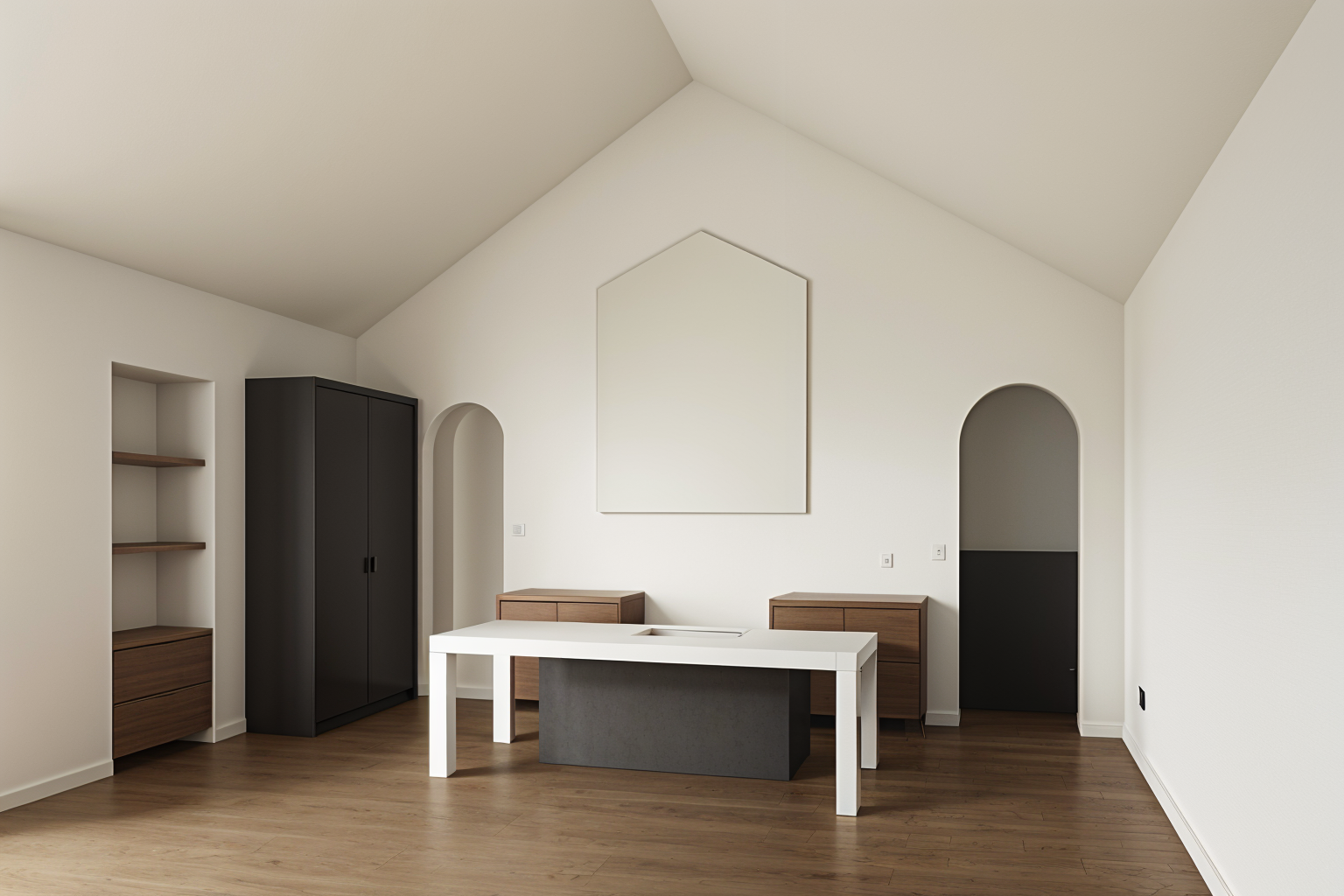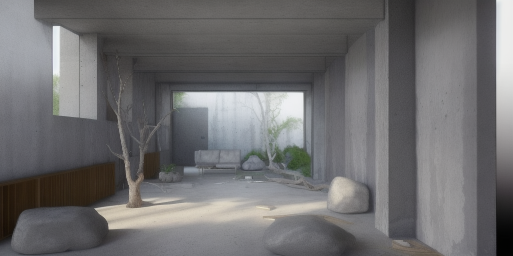 render this space exactly as it is without adding or changing any elements the room is a long concrete corridor with visible ceiling beams and rough worn walls on the left side windows let in dim twilight inside the space the ground is covered with dark soil there are large stones bare tree trunks and one big branche on the floor to the right a tub in metal for an animals to drink out and a tree stump behind the tree to the right everything should remain exactly as shown in the original layout apply dramatic slightly eerie lighting coming through the windows on the left casting long shadows and enhancing the atmosphere the overall mood should be mysterious and cinematic render the image in in a watercolor style with rich contrast detailed texture that captures the rawness of the space architecture