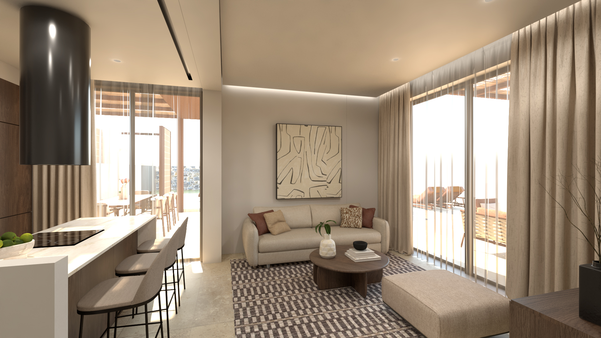 hyper realistic interior of a living room interior in soft natural colors during golden hour