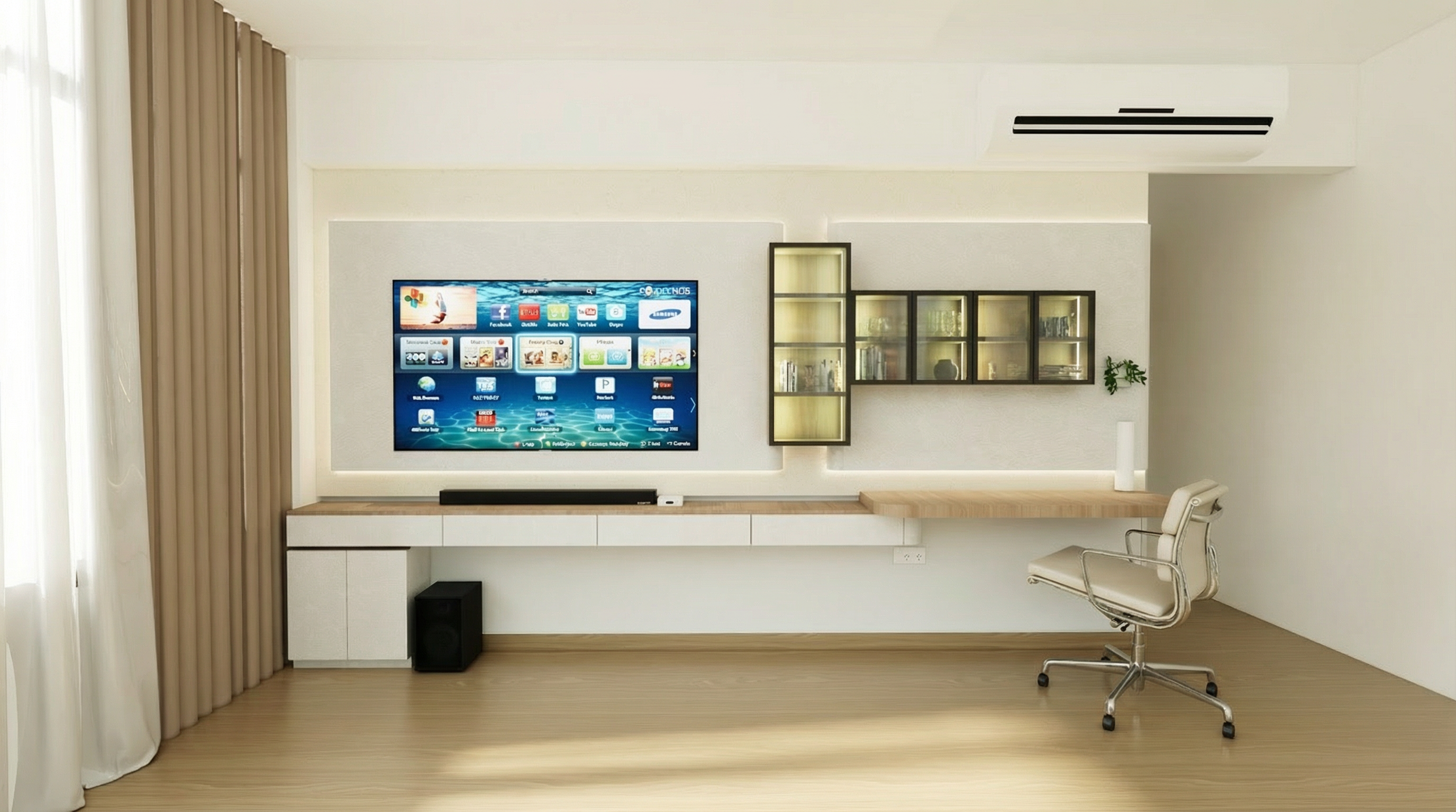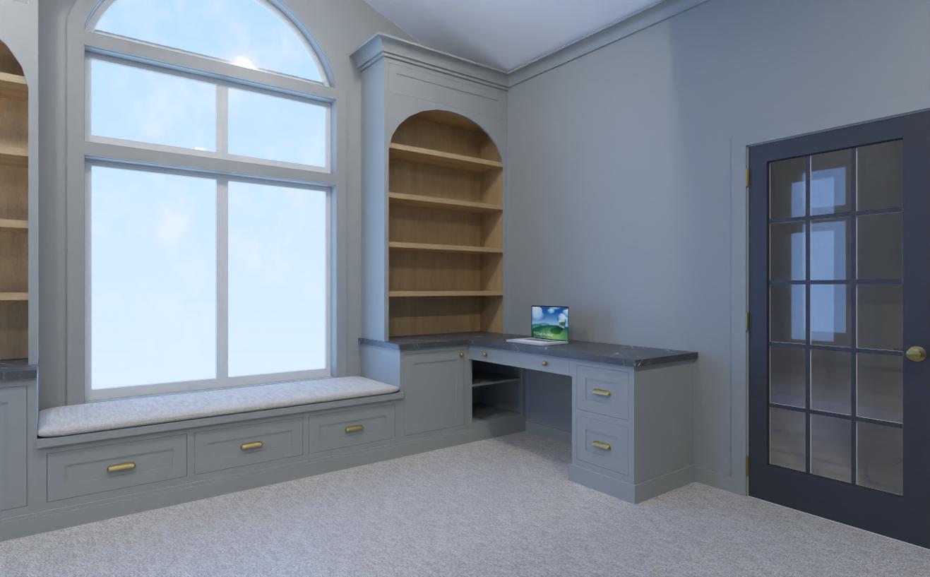 render a luxuriously elegant room corner featuring a built in bookshelf make the bookshelf wood grain a rich warm oak design the frame and cabinets in a sophisticated warm gray with gold knobs for an opulent finish the walls should match the warm gray cabinets offering a calming and neutral backdrop incorporate a soft plush carpet in a creamy light greige to add warmth through the window allow a partly cloudy mid afternoon sky to enhance the serene atmosphere aim for a modern minimalist style with a touch of classic elegance