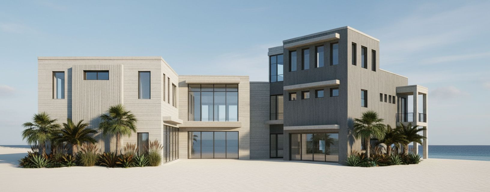 render a two story modern house with a pitched roof exterior walls in warm sand tones with white trims for windows and doors roof in dark gray shingles front porch in light gray wood with matching stairs incorporate large glass windows for a modern touch surround with a lush green garden and soft golden evening light to create a warm inviting atmosphere