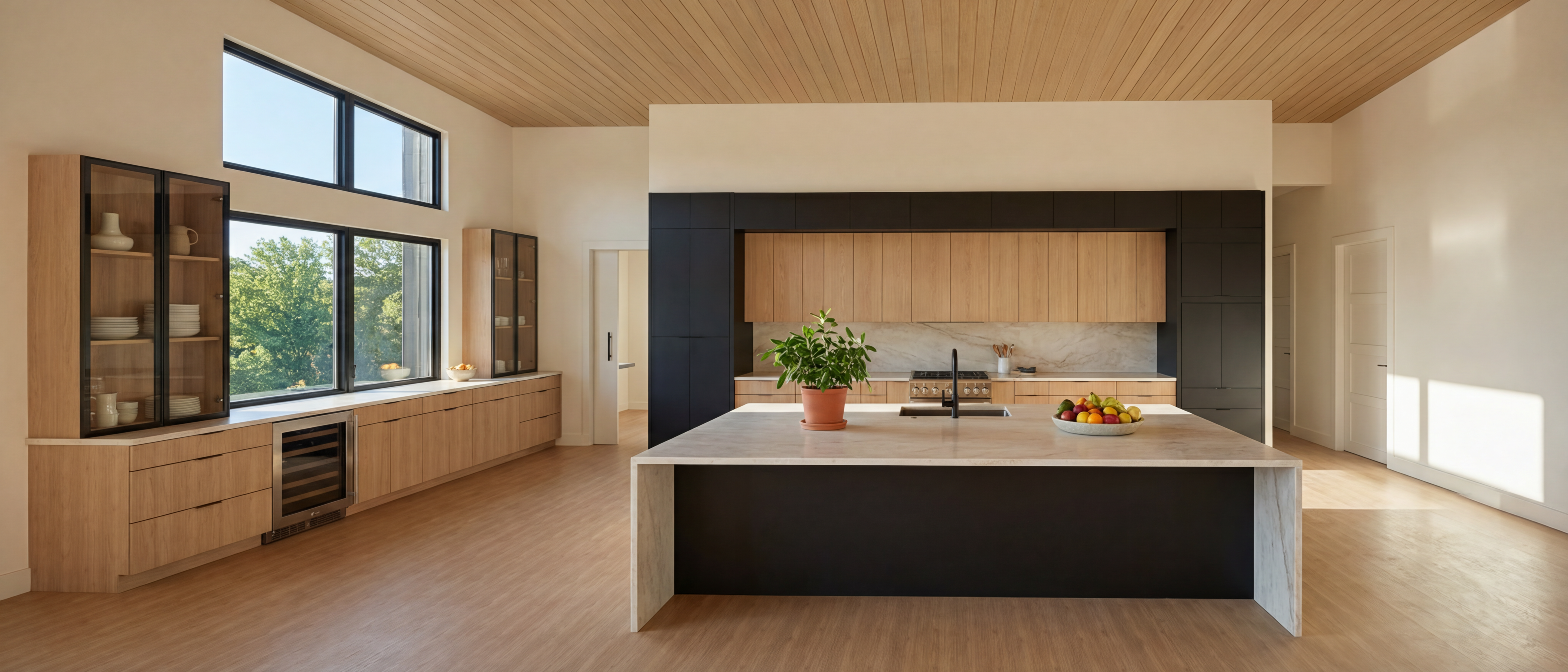make the brown cabinets more realistic make the down part of the kitchen island concrete and without hidden light add hidden lights at the wine cabinet keep the hidden lights at the kitchen and the curtains make the glass at the wine cabinet more transparent