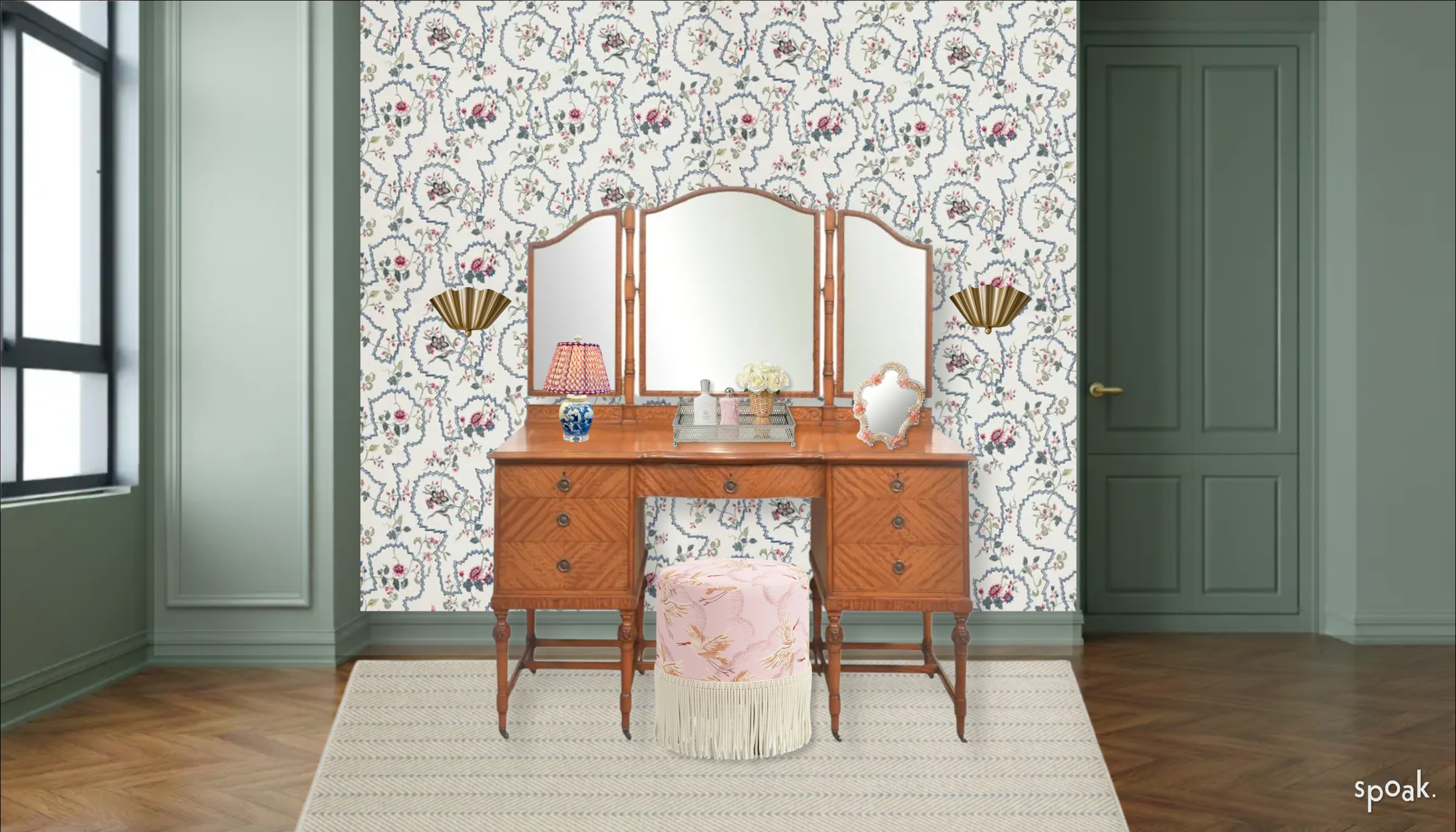 enhance this image with realistic natural lighting and subtle shadows to give it depth while maintaining an editorial photography aesthetic preserve all objects patterns colors and proportions exactly as they are especially the wallpaper and each item do not alter any product pattern or placement focus only on refining textures enhancing surface realism and adjusting lighting dynamics for a professional photographic finish every item must remain exactly as it is since all items are for sale