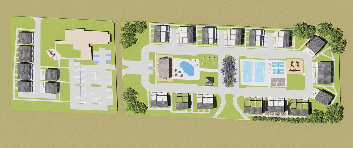 make a fully rendered master plan and continue adding realistic native georgia planting in the grass areas do not touch the blue parking spots they are handicap spots also make the pool look detailed in the center but leave the blue tennis courts on the right alone also use more oaks throughout also only design the site not the outside