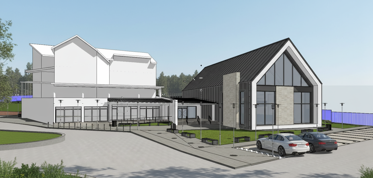 turn this sketch into a 3d model the vertical battens should be an untreated aged pine colour the windows should be clear with crisp white frames the render should be surf mist dulux with a bagging finish