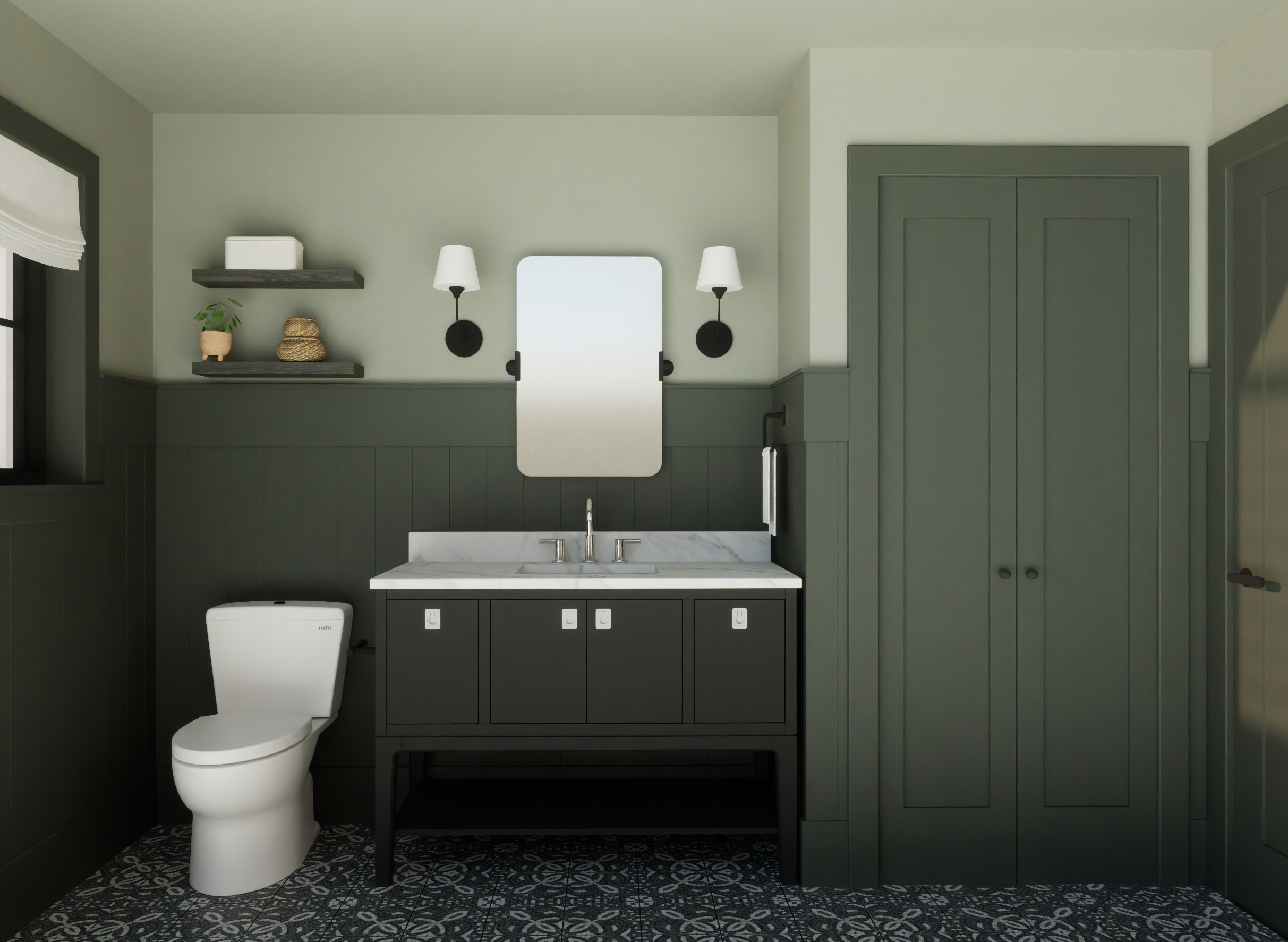 render an elegant bathroom interior with a soothing and modern atmosphere the walls are a soft sage green with wainscoting in a darker olive green the vanity is a deep charcoal grey with a sleek white marble countertop the floor features intricate black and white geometric tiles include a round mirror with brushed metal fixtures above the vanity and vintage black wall sconces with white shades there are floating shelves adorned with natural elements like potted plants and woven baskets adding warmth and texture the overall lighting is soft and inviting accentuating the calm and serene ambiance