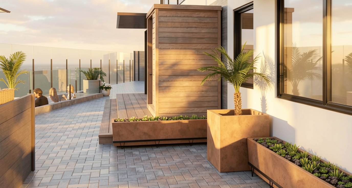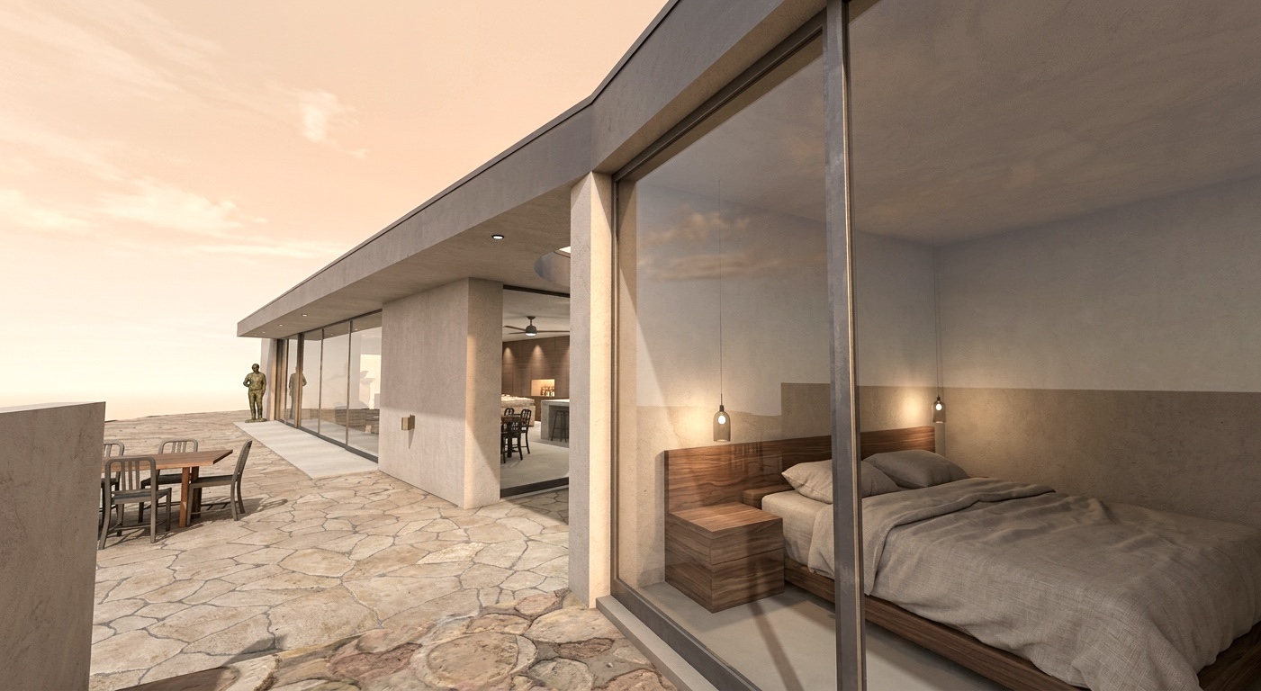 add two medium sized boulders on the ground behind the dining table up against the house