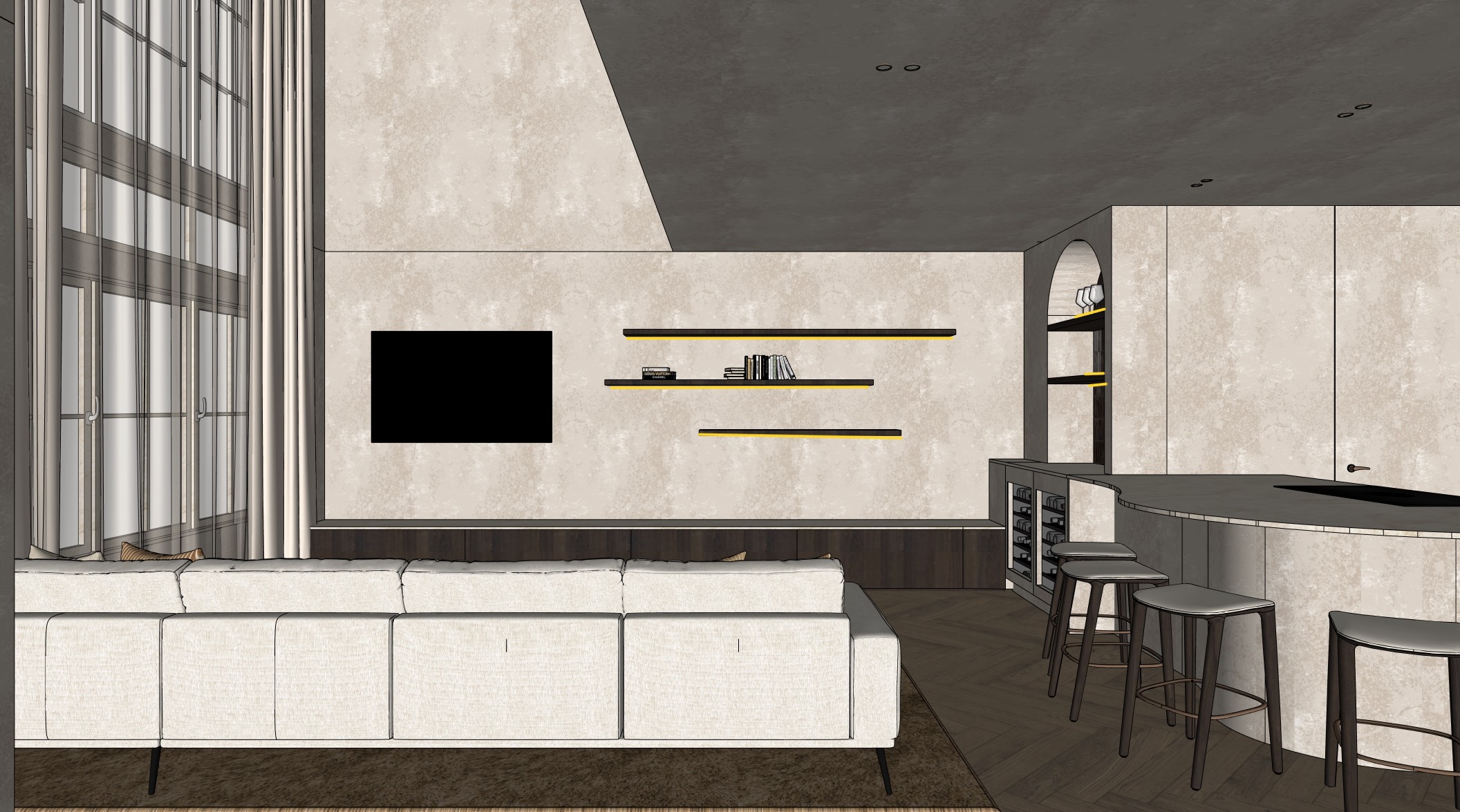 high end living kitchen living wall view with bar arch niche strict camera match full scene lock 4k ultra photorealism pbr only no redesign create an ultra high end 4k ultra photorealistic architectural interior render based strictly on the uploaded reference image this exact viewpoint this is an existing interior design all spatial layout geometry proportions wall positions ceiling planes shelving layout bar shape kitchen island wine coolers arched niche living furniture window position and circulation must remain 100 identical to the reference image no redesign no reinterpretation no repositioning no added or removed elements camera must match exactly treat the reference image as a camera matched architectural backplate camera image quality absolute lock exact same camera position height and distance same framing and crop same perspective and vanishing points architectural lens feel 24 28 mm perfect verticals no distortion image quality 64k resolution ultra sharp focus across entire image no depth of field no blur haze fog or bloom crisp edges extreme micro detail architecture geometry fixed living area viewed from behind the sofa long living wall with integrated tv floating shelves on the living wall curved bar kitchen island on the right integrated wine coolers under the bar large arched niche behind the bar no rounded corners on walls or ceilings all wall and ceiling intersections are sharp and straight no visible seams joints or panel lines in walls walls read as continuous monolithic plaster surfaces led lighting strict image rule led strips are allowed only under the shelves legboorden allowed led locations under floating shelves on the living wall under shelves inside the arched niche no led under the bar toog no led under island overhang no led in ceilings no led behind walls or cabinetry led behavior warm neutral light 2700 3000k soft downward indirect glow even distribution led source not visible walls ceiling continuous plaster locked decorative plaster paint technique identical to reference mineral lime based appearance subtle texture and tonal variation matte not flat no seams no joints no panelization wood elements dark veneer pbr only applies to floating shelves lower living wall cabinetry bar stool frames material requirements physically based rendering only albedo roughness normal micro normal maps correct real world grain scale visible pores and fiber depth satin matte lacquer reflections stone taj mahal quartzite mandatory taj mahal quartzite must be used on bar island countertop upper countertop on the lower cabinets bovenblad op onderkasten lower cabinet cladding under the bar properties pbr only satin finish real mineral veining accurate roughness and ior soft realistic reflections no gloss no flat appearance wine coolers integrated under the bar front panels identical to wall finish plinth in lighter pale tone bottles transparent glass only realistic thickness and refraction arched niche dark veneer shelves seamlessly integrated decor exactly 3 wine glasses ultra clear glass realistic refraction no additional decor bar stools geometry lock critical bar stools must remain 100 identical in shape to the reference image exact same geometry exact same proportions exact same seat thickness exact same leg geometry and angles exact same footrest position no redesign no reinterpretation no smoothing or stylizing upholstery material only beige boucl fabric clearly visible looped fiber structure pronounced texture and depth natural irregular weave soft matte appearance only the material may change the shape must not change sofa sofa identical to reference upholstery unchanged natural fabric texture and folds rug color texture lock rug position and size identical to reference color identical to reference high pile fluffy texture clearly visible fibers matte light absorption floor pbr detail herringbone parquet one tone lighter than reference visible grain and relief micro normal detail natural satin sheen natural light location specific natural sunlight entering through the window soft realistic belgian coastal daylight view from first floor elizabethlaan 96 knokke balanced exposure no overexposed glazing artificial light supporting only ceiling spots visible in the image bronze finish actively emitting light realistic light cones with soft fall off warm neutral temperature negative prompt mandatory design changes layout changes changed bar stool shape altered stool geometry redesigned stools rounded walls rounded ceilings visible wall seams panel lines led under bar led under island leds outside shelves non pbr materials flat shaders cgi look stylized lighting cinematic lighting glossy plaster plastic materials fake wood wrong rug color flat rug blur haze fog bloom noise camera change people clutter game engine look