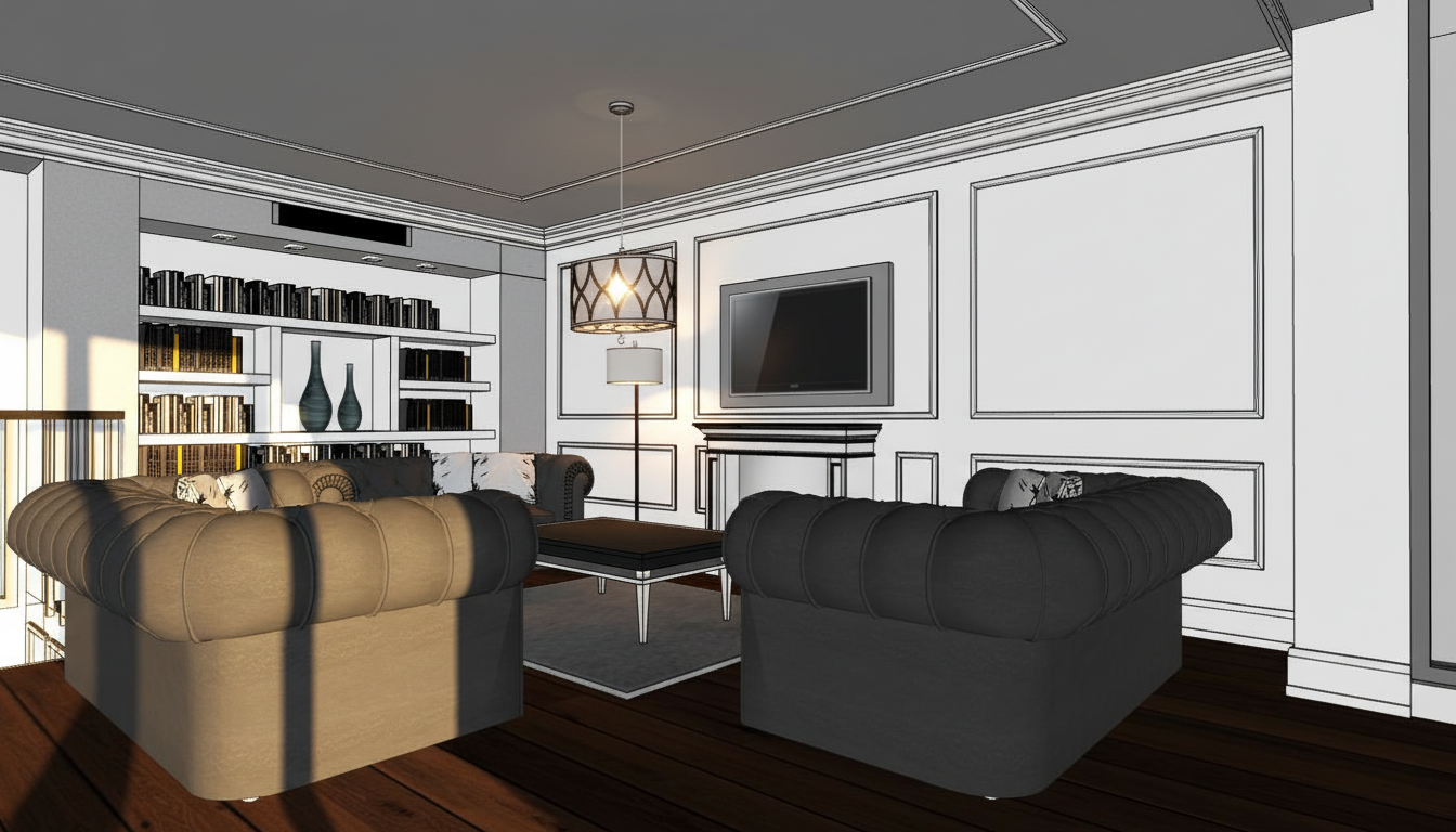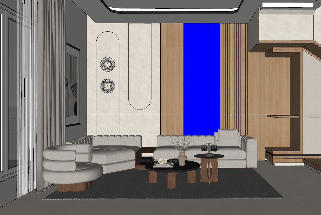 create an ultra realistic image from this jpeg add indirect light to ceiling and curtain valance add ceiling spot lights and add soft outdoor light use glossy soft cream stone textured to the floor and use warm off white for walls and the ceiling is white blue color is bronze mirror add some decorations and add indirect light to the shelve do not change the materials shape and size