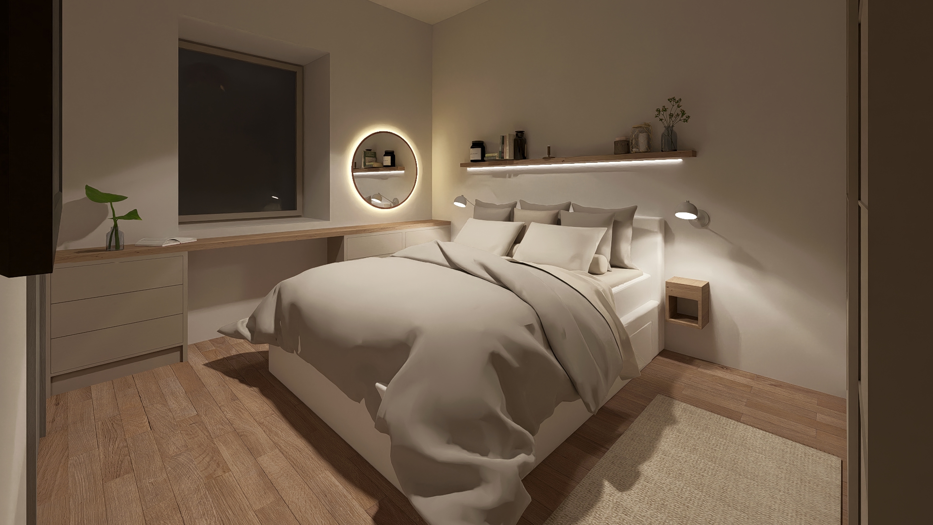 make this render more realistic dont change the colors and the shapes please add curtain to the window
