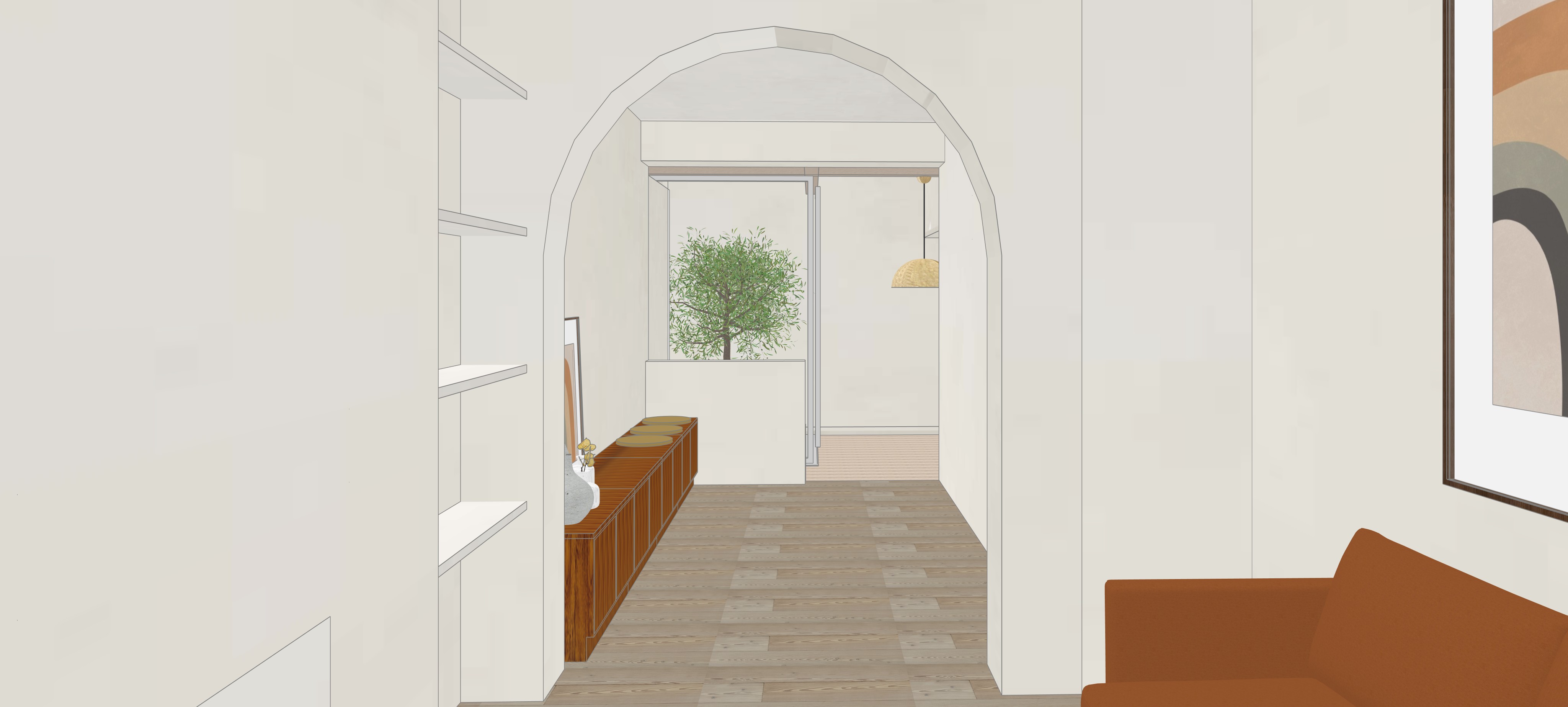 a cozy mediterranean atmosphere the walls are a subtle off white plaster complementing the mid toned long uninterupted plank wooden floor with grain textures an off white boucle sofa is positioned in the foreground on the right hand side only adding warmth and vibrancy on the wall there is no art a mid century modern sideboard in rich walnut color stands under a bright window where a lush green olive tree plant is visible outside a dome pendant in a brushed brass is visible in the background casting soft warm light creating an inviting and harmonious setting in this distance a secondary room has teraccotta flooring