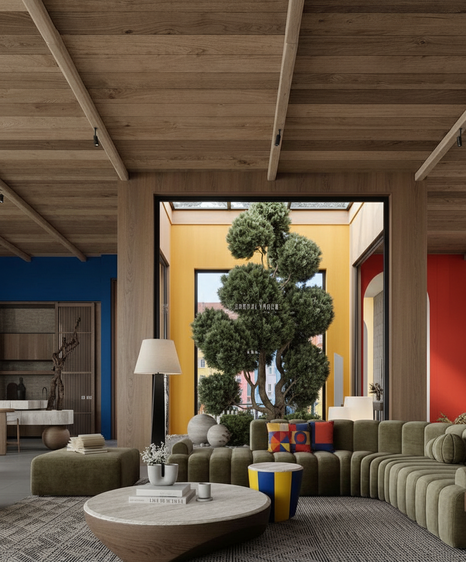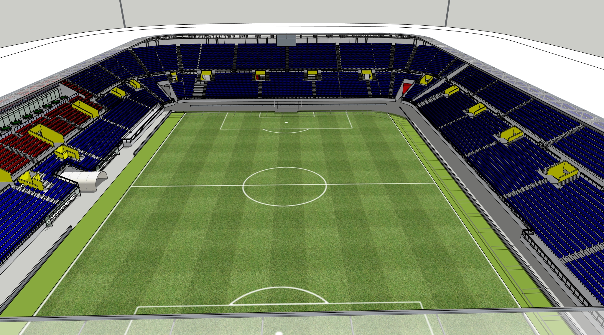 a vast state of the art football stadium under an overcast sky with vibrant green grass on the field perfect white markings and deep blue seating throughout the stands yellow accents dot the seating areas for a pop of color complemented by rich red sections adding warmth a sleek metallic gray structure surrounds the seating creating a modern and dynamic atmosphere emphasizing a sense of anticipation and energy
