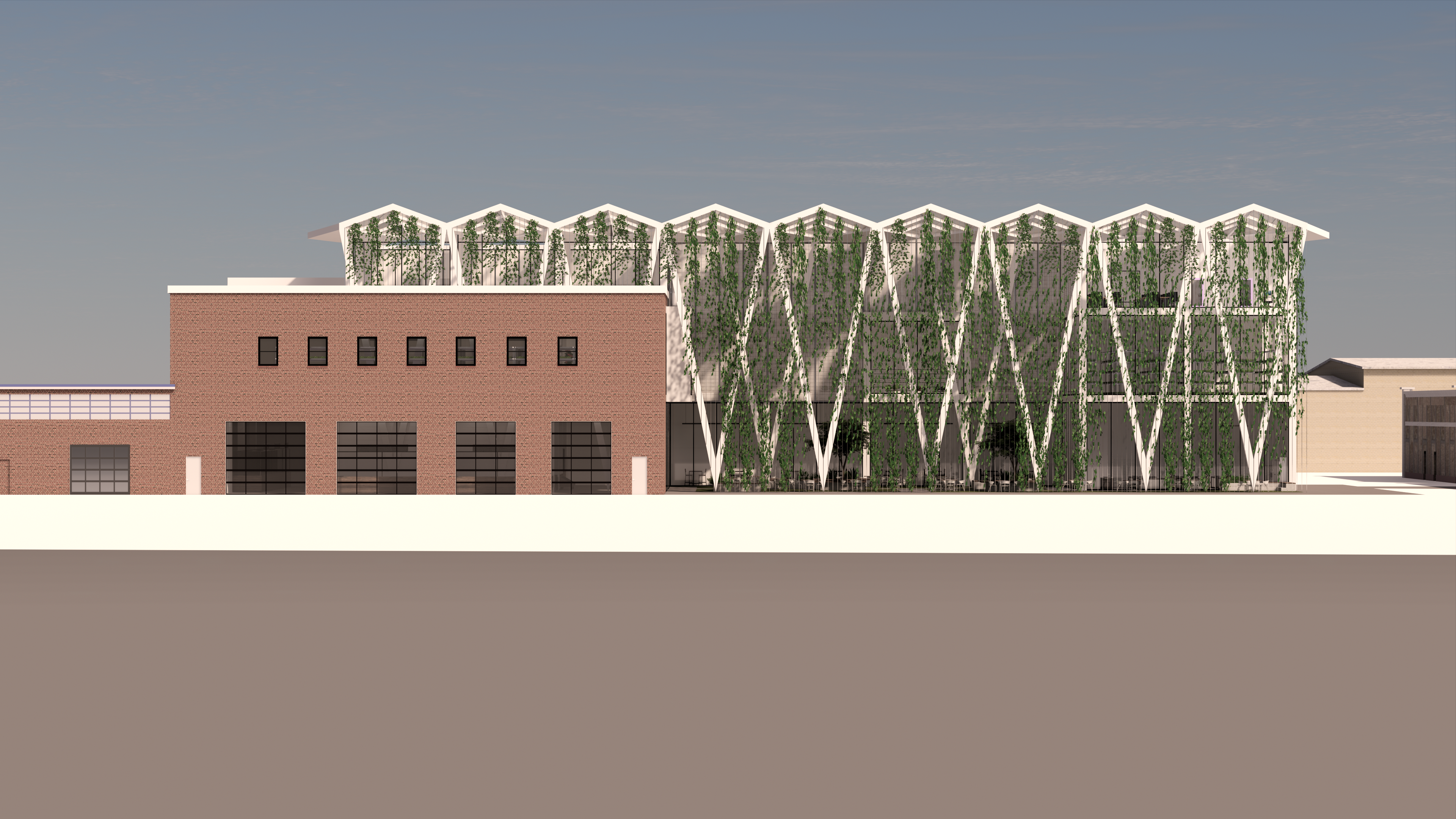 use this exact starter image and preserve the camera proportions architecture and composition do not crop or distort the building refine realism while keeping a calm bright architectural elevation aesthetic 1 ground plane adjustment reduce the thickness and visual dominance of the sidewalk zone so it reads as a slimmer edge condition before the street keep the sidewalk lighter than the street but more subtle and less heavy 2 vegetation refinement improve the vines so they appear more evenly distributed refined and intentionally trained remove the appearance of block repetition or cloning make coverage smooth coherent and softly continuous across the fa ade keep the vines light and architectural not dense or forest like increase leaf clarity and thin stem detail but maintain a delicate veil quality add natural variation without creating patches or bands 3 material and depth maintain soft interior illumination gentle contact shadows brick texture variation and clean white framing preserve fa ade realism improvements already achieved 4 lighting and atmosphere keep bright neutral daylight soft sky and competition style clarity no haze bloom or saturation changes do not add people objects entourage or new context only refine sidewalk proportion vine uniformity and overall fa ade clarity