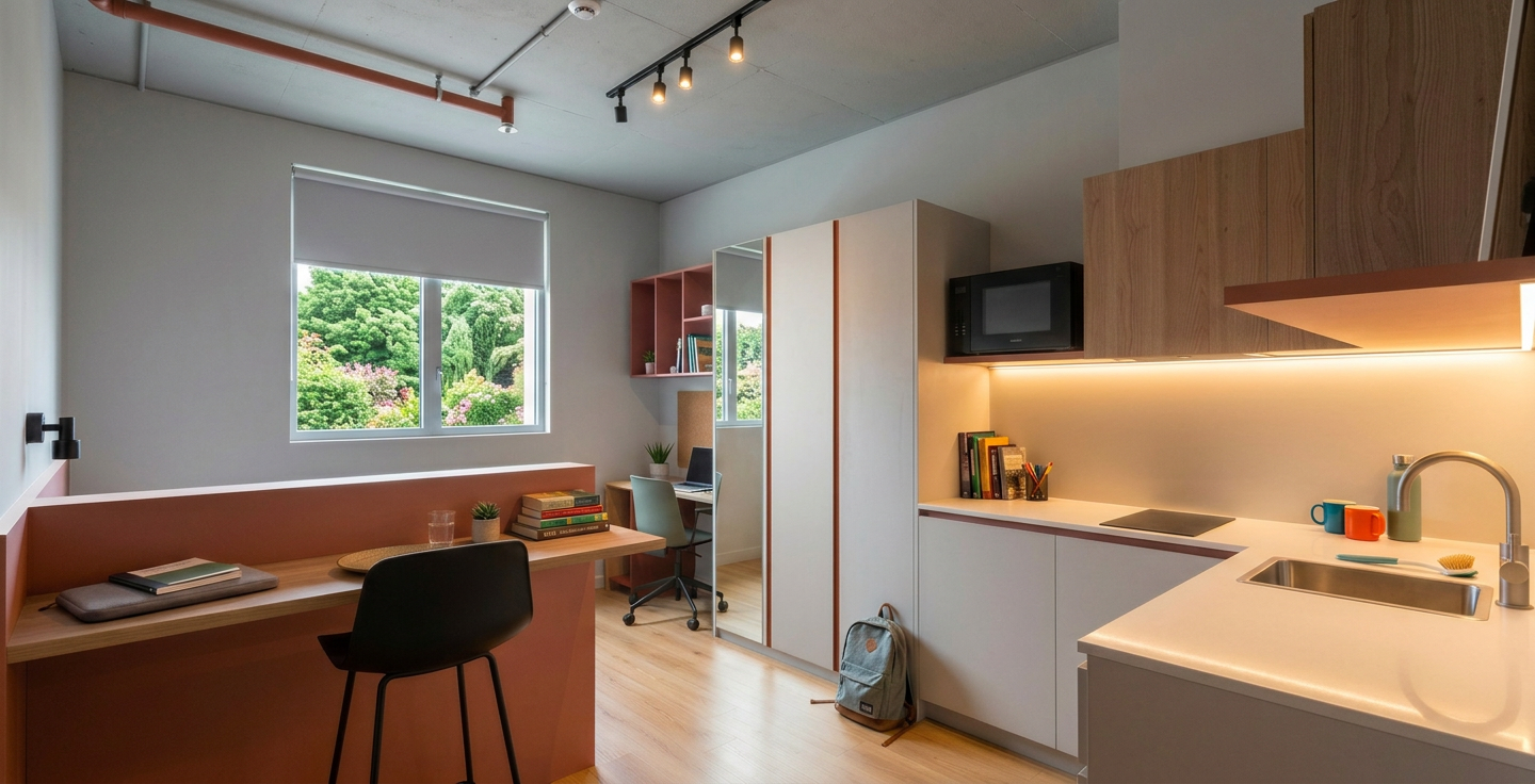 crea una imagen fotorealista a partir de este sketchup realza las texturas y la iluminacion la parte de pared del fregadero es un papel con rayas a ade mas iluminacion la escena parece oscura