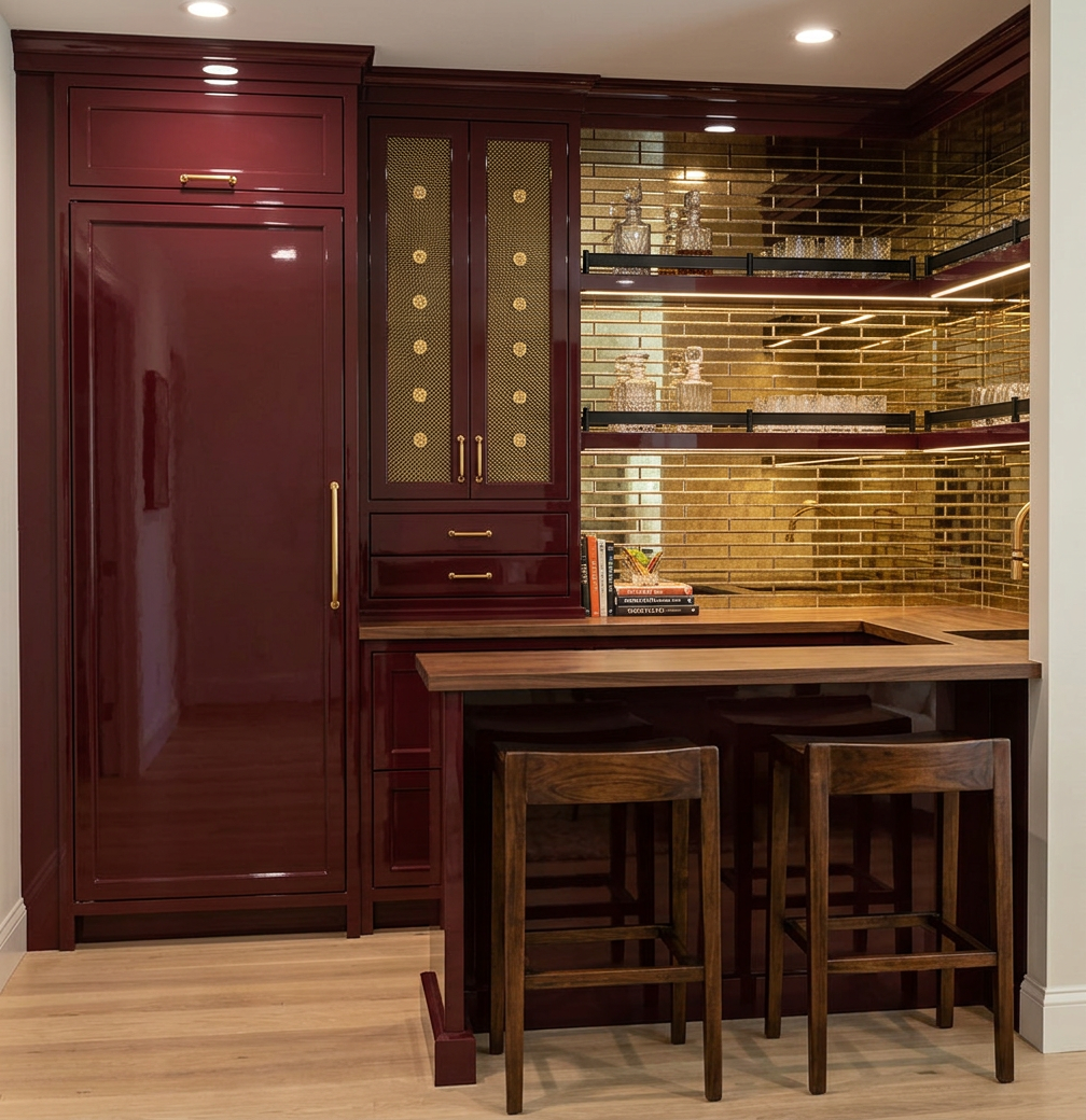 enhance this interior rendering to look more photorealistic add recessed ceiling can lights evenly spaced inside the wallpapered ceiling with a black housing add integrated led strip lighting inside the tall shelves on both sides of the tv to softly illuminate the shelving include subtle under cabinet lighting along the countertop on the right side style the shelves with modern video gaming accessories such as game consoles controllers on display stands gaming headsets a few collectible figurines and small tech decor add subtle rgb accent lighting behind some shelves to create a modern gaming lounge atmosphere while still keeping the space clean and upscale maintain realistic shadows reflections on the countertop and natural light coming from the window