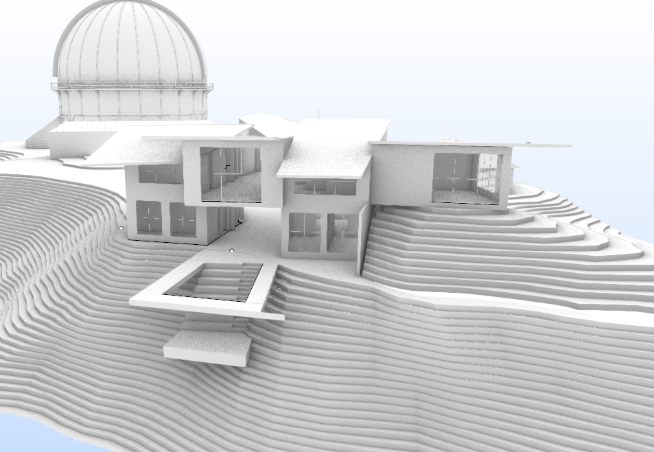 make this building have white oak siding going horizontal and black metal corrugated panels for the look make it de on a mountian with brown and green cloors add clouds to the sky