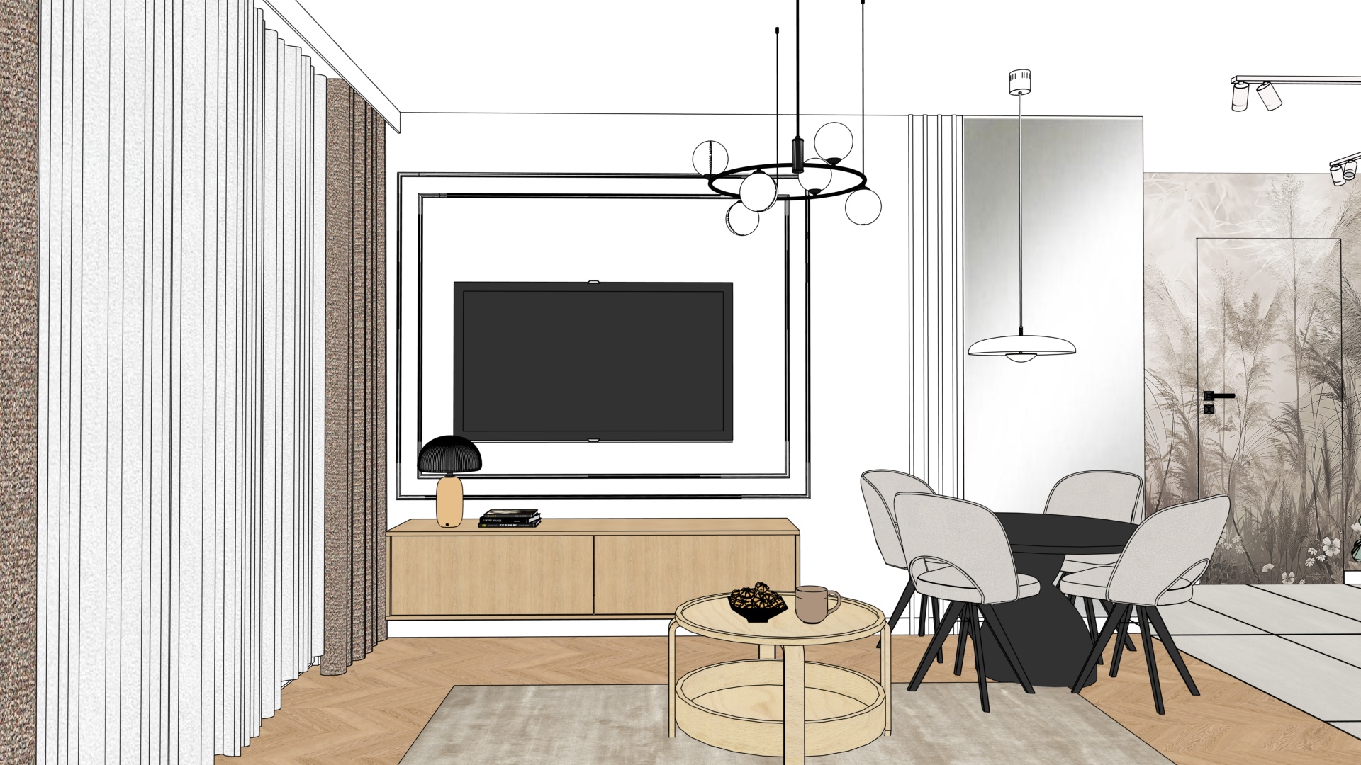 fotorealistyczna fotografia wn trza klasy premium projekt uk ad meble i materia y bez adnych zmian wzgl dem obrazu wej ciowego naturalne wiat o dzienne perfekcyjna ekspozycja naturalny balans bieli bardzo realistyczne materia y i detali zero zmian zero okien lampa nad sto em okr g ym ma kolor bia y krzes a lekko szare bez oblam wki meble drewniane s w kolorze egger vicenza za okr g ym sto em na cienie jest du e lustro zaznaczione kolorem szarym