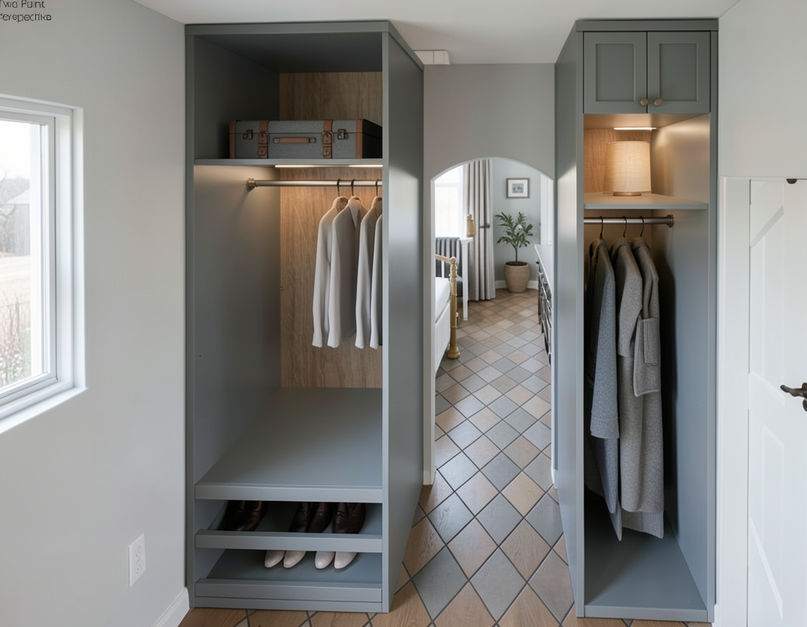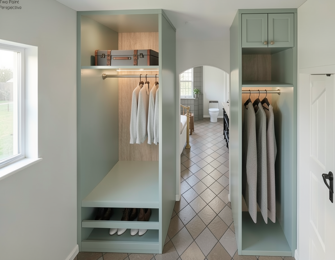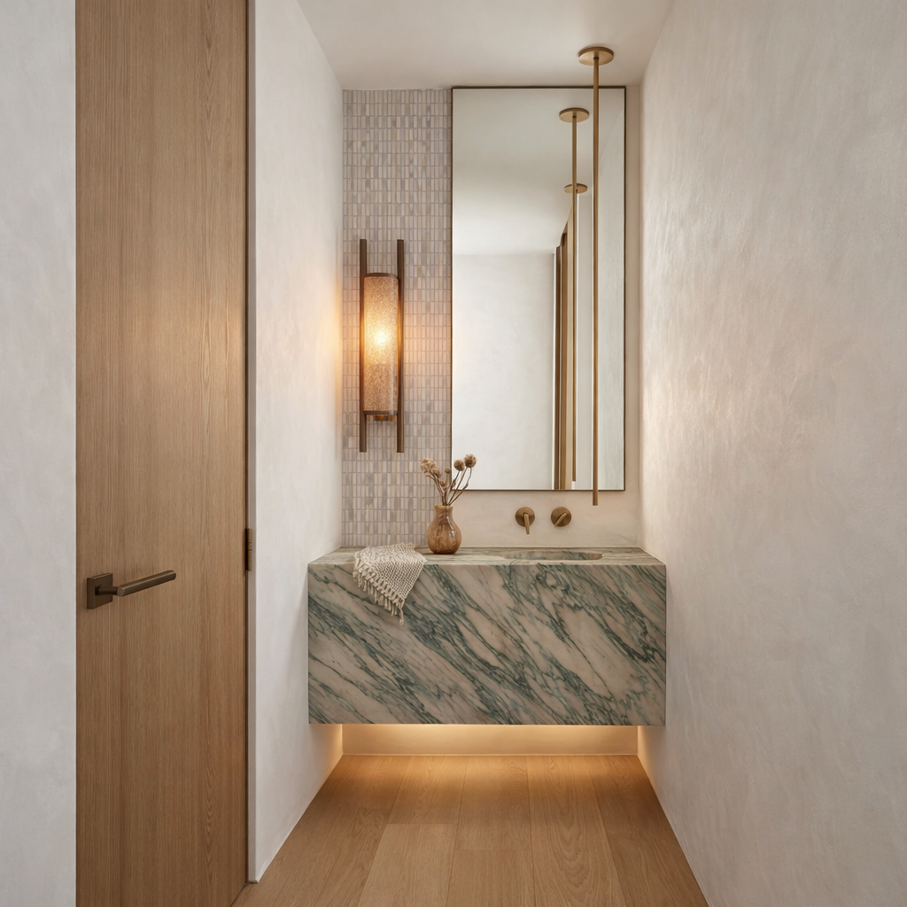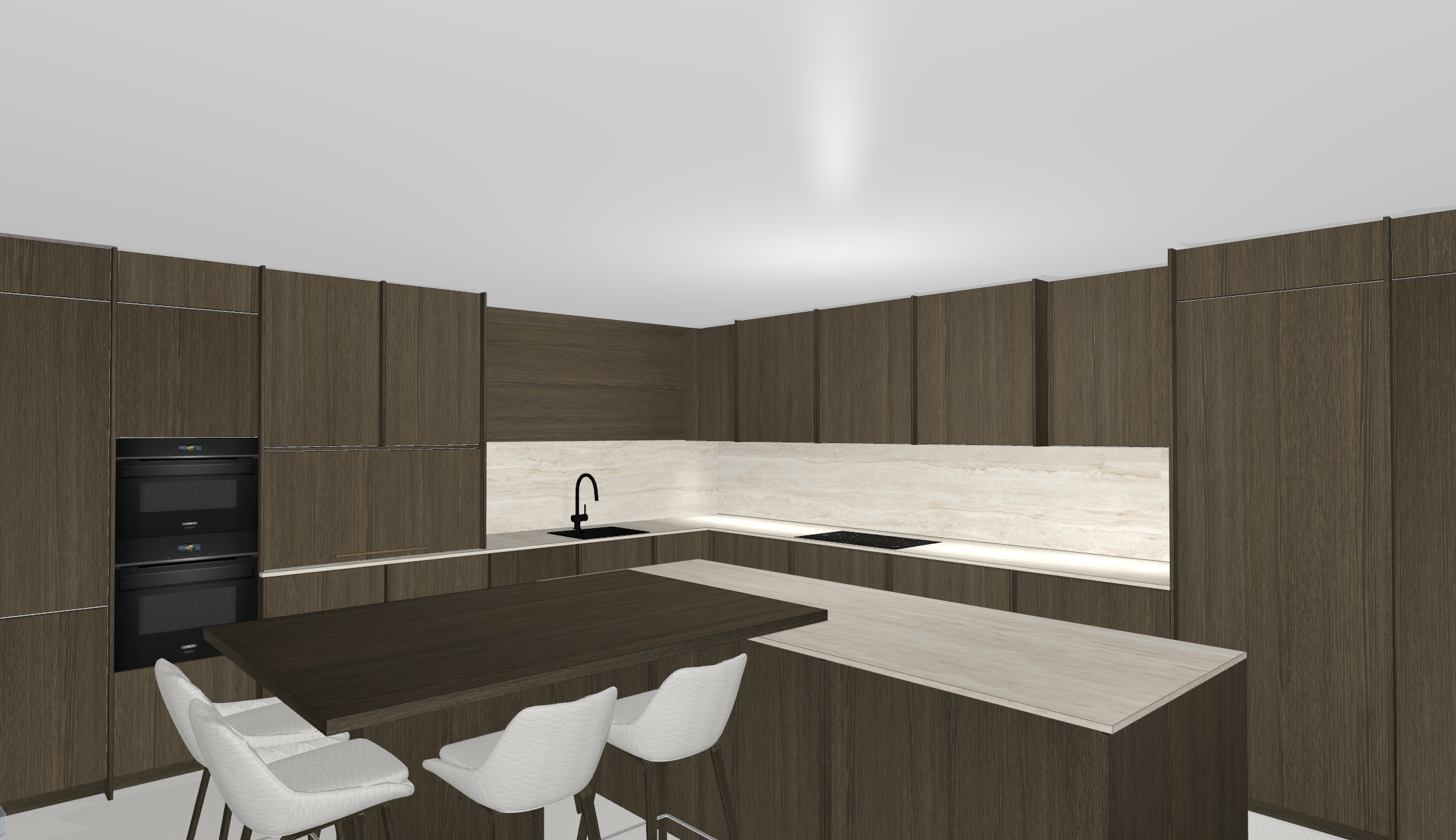 high quality kitchen with dark plain oak veneered cabinets a matt travertine worktop and backsplash and a table on the island top in th esame finish as the cabinets