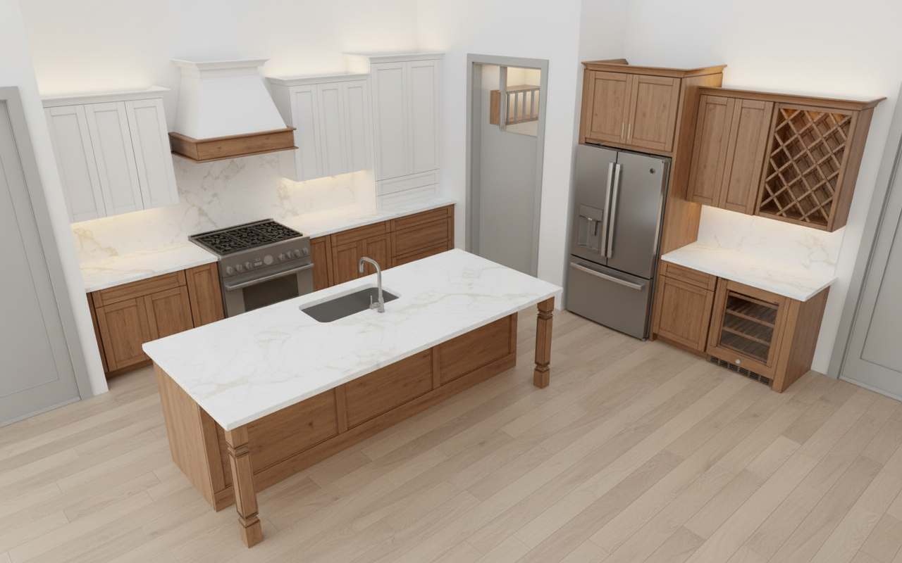 upper cabinets are white lower cabinets are stained wood medium brown countertop is a white quartz with light brown and gold veining the veins are small but frequent the sink faucet is gold upper cabinets next to and above refrigerator are the light brown stain as well the long upper cabinet on the counter near the oven is light brown stain as well the floors are a light stained wood the walls are white the door trim and doors are light grey the doors are solid do not have glass the bottom band of the range hood is also the stained color the sink basin is a matte graphite color there is under cabinet lighting there are uplights above the cabinets