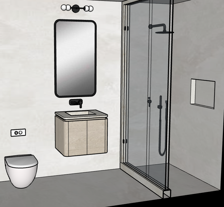 render in 4k bathroom make it realistic but exactly to scale keep the same proportions the vanity is light oak wood the plumbing fixtures are black