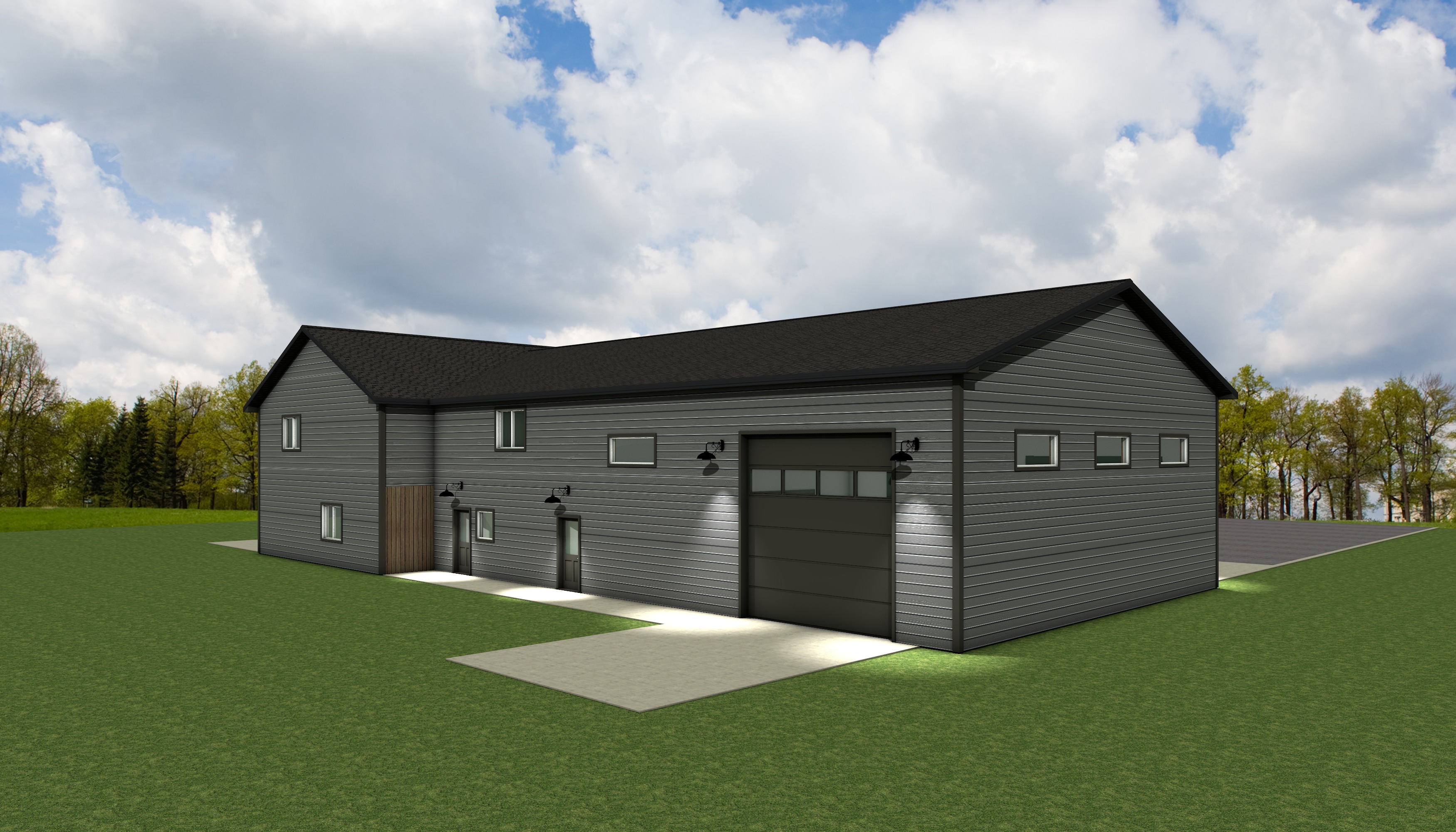 a modern two story house retain the exact structure colors and window arrangement rooflines siding foundation height and proportions exactly as shown in the reference image make the siding darker gun metal gray color all second floor roofs are black shingles and lower roofs are metal as shown integrate into the terrain there is a lush dense forest of mixed hardwoods that are a little further back add cooler afternoon sunlight subtle dappled highlights across the siding and grass create ultra realistic lighting crisp shadows detailed textures in the siding and glass reflections and an overcast sky show only a few lights visible inside render in hyper realistic architectural visualization quality 8k resolution add a driveway tying into the concrete garage door apron make it the summer season remove covered porch roof and columns