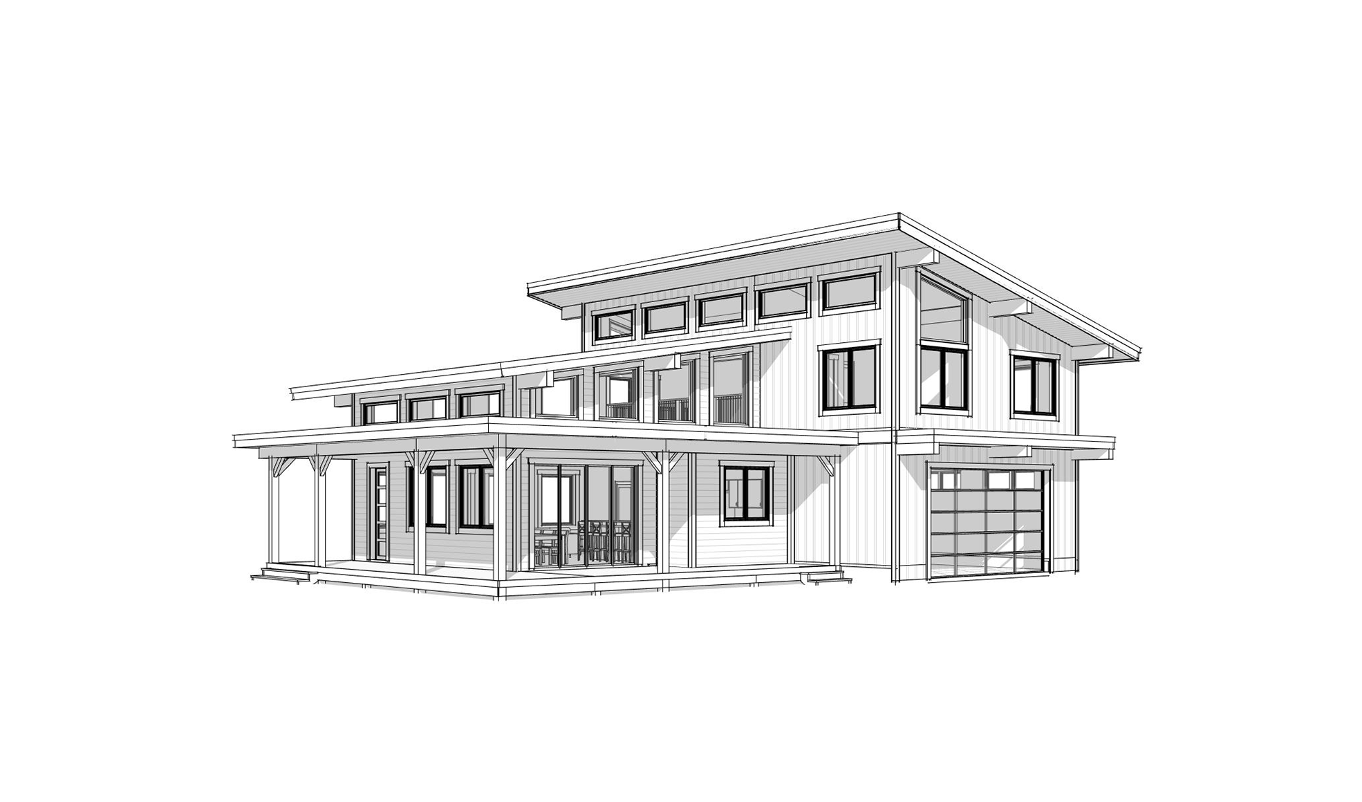 back view of a clean modern cabin architectural exterior home rendered in cinematic daylight lighting with bits of blue skies and sunlight coming through the clouds cabin in the woods with green grass and big fir trees and a faint hint of a mountain range in the far distance in the background warm glow and reflections off of the windows select grade vertical wood siding green manicured landscape around structure with gardens and patches of grass black standing seam metal roof high fidelity photorealistic visualization crisp shadow falloff refined facade geometry soft atmospheric depth premium architectural photography mood ultra clean composition and materials photorealistic render add black trim around the windows and doors prominent trees scattered around the property concrete driveway leading up to garage doors