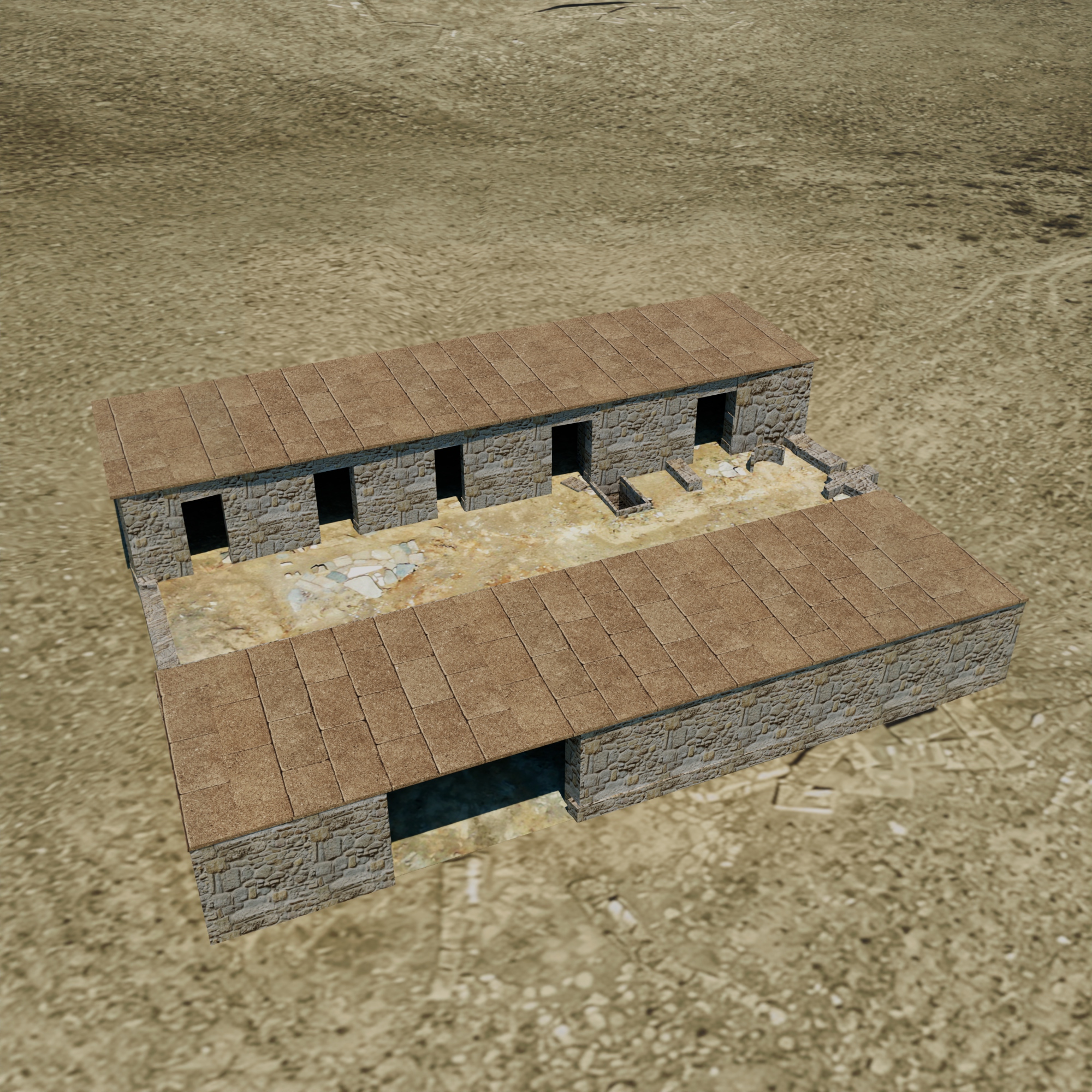 ancient stone building in a vast desert landscape captured from an aerial view the structure features robust textured stone walls in shades of light gray with earthy brown tones the flat roofs are a subtle sandy brown complementing the surrounding sandy desert terrain the atmosphere is serene and timeless under a clear blue sky desert landscape showcases subtle variations of beige and tan enhancing the ancient architectural ambiance