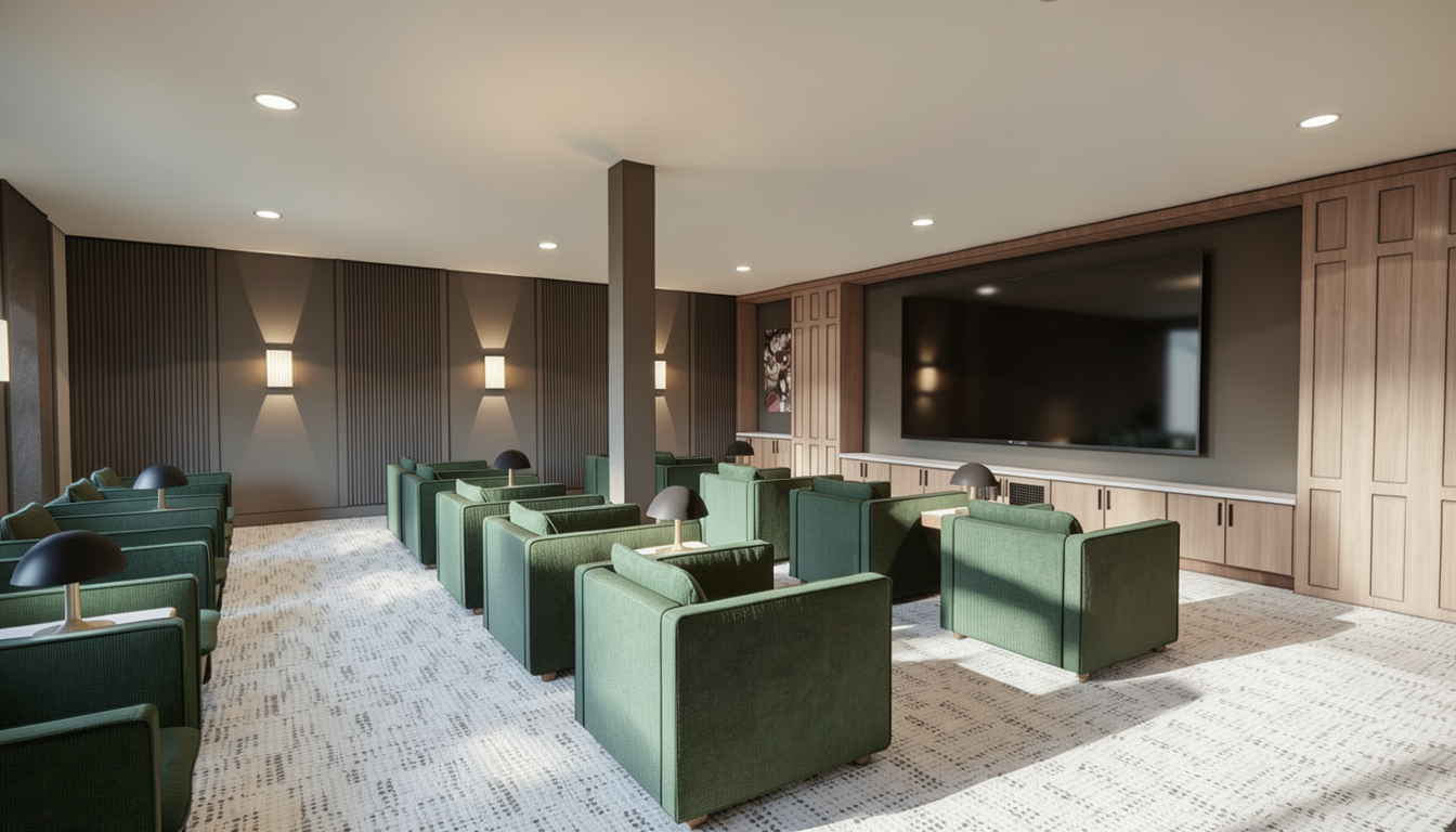 create a serene and modern living room scene with a large minimalist entertainment unit against a cream colored wall the unit should have sleek dark walnut wood paneling and glossy white compartments for a sophisticated look place a flat screen tv in the center on the left add a lush green plant in a simple black pot bringing a touch of nature indoors the flooring should be rich warm toned hardwood exuding elegance position a cozy beige shag rug on the floor for texture on the right incorporate sheer textured taupe curtains softly drawn back to reveal a gentle stream of natural light add a modern floor lamp with a soft lavender shade beside the curtains to provide a warm ambient glow the atmosphere should be tranquil and inviting with an emphasis on clean lines and harmonious colors