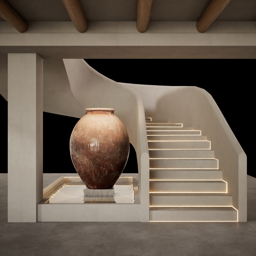 a large rustic terracotta colored amphora sits in a shallow pool of water illuminated by soft warm light the amphora is positioned to the left of a modern curving staircase with integrated led lighting that casts a gentle glow on each step the staircase is made of a smooth light colored material possibly concrete or stucco and curves upwards to the right above the scene exposed wooden beams are visible suggesting an architectural element like a pergola or ceiling structure the background is a stark black emphasizing the illuminated elements of the composition the overall aesthetic is minimalist and sophisticated with a focus on natural materials and subtle lighting