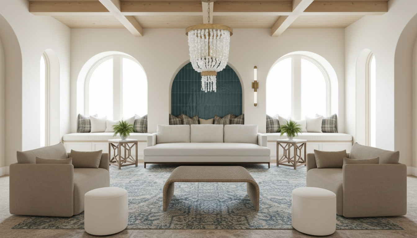 photorealistic high resolution interior polished concrete floors white walls and light metal orange finishes the space is lit up with soft ceiling soft lights bright lighting and overall environment is soft bright lighting tv wall on the right is white with an orange surround inset the overall mood is warm lighting track lights shine down on walls light rings hang from ceiling middle part and furniture below