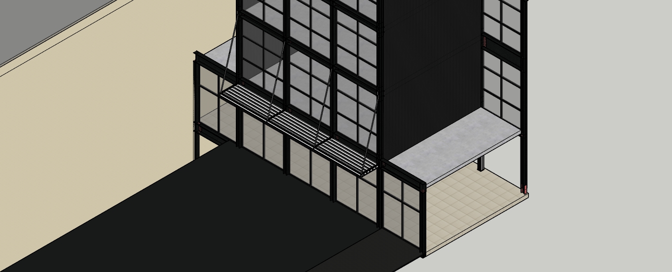 exterior shot metal structure black steel profiles glazed fa ade steel eave attached with steel cables outdoor space is paved with black granite tiles on both sides beige plaster walls with wooden framed windows