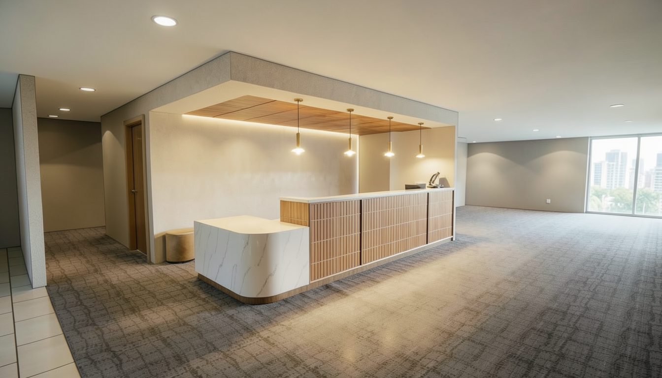 design a modern food stall exterior within a continuous indoor food hall where stalls are directly adjacent to one another with no gaps or walkways between them the stall front features light colored vertical wood slats e g white oak or maple tone the slats extend upward but stop below an act acoustic drop ceiling maintaining an open gap above near the top of the fa ade include a horizontal protrusion bulkhead element that represents a concealed structural i beam between the stall and ceiling this feature should feel intentional and integrated into the design the left and right side wall areas are solid and intentionally blank not cutouts or openings these surfaces along with any non wood portions of the fa ade are finished in smooth white gypsum board white gyp to create a clean minimal contrast with the wood slats provide a service opening with a clean counter and include visible front facing equipment e g undercounter refrigeration prep surfaces arranged neatly and minimally do not include menu boards the mass directly above the counter should remain intentionally blank designed as a dedicated zone for a future hanging sign with no graphics or fixtures applied lighting should be warm and subtle integrated into the stall such as linear lighting or small downlights to highlight the wood texture and service area without clutter the stall should read as modern clean and warm standing out while still fitting cohesively within a tightly packed row of neighboring stalls with varying designs