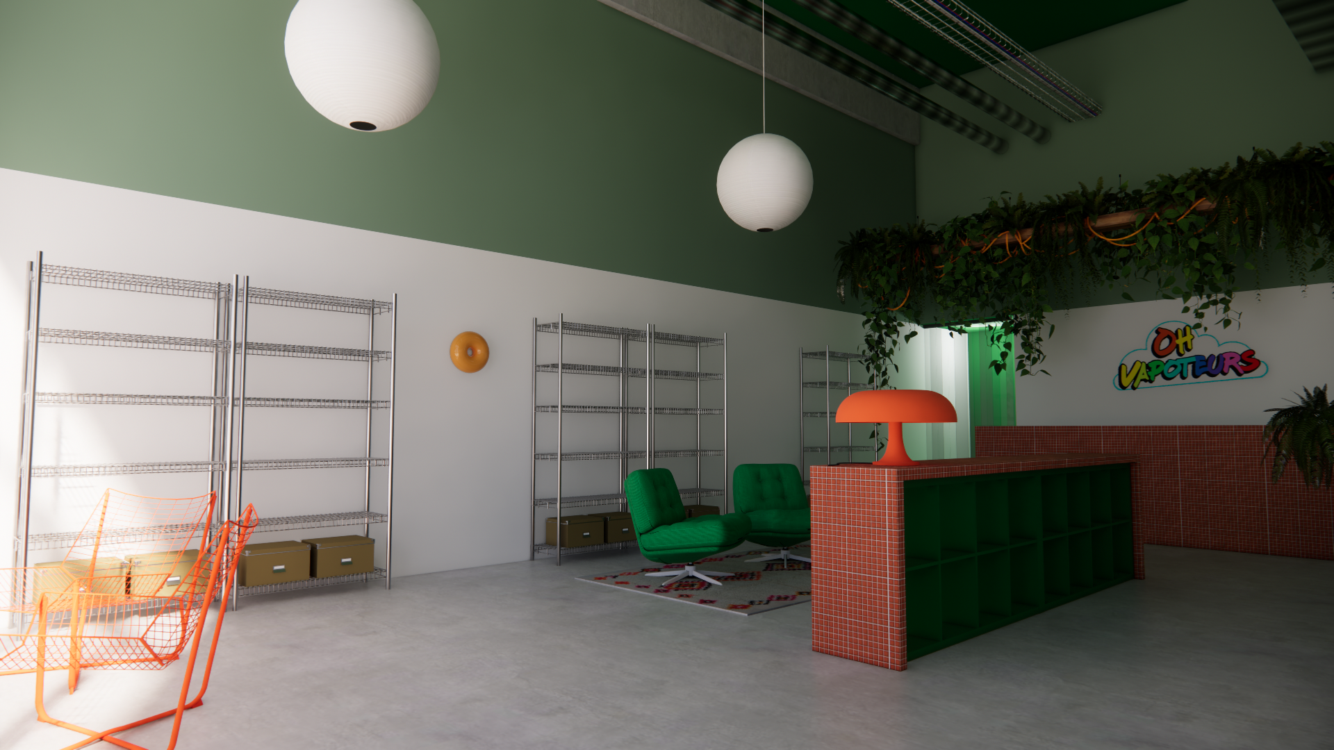 rend cette image hyper r aliste avec une luminosit claire et agr able c est une boutique de liquides pour cigarettes electroniques ajoute des flacons d e liquides avec un packaging color sur les ag res ajoute une caisse avec une tablette lectronique sur le comptoir du fond ajoute des coussins dans les chaises orange ne modifie pas l am nagement et le mobilier am liore le rendu de la v g tation