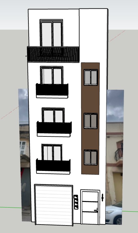 ultra realistic architectural render of the provided sketchup facade this is a strict image to image enhancement preserve the exact front elevation camera angle proportions and composition do not change geometry or viewpoint primary material full facade replace all facade surfaces with smooth painted masonry rendered plaster finish main facade color warm sand beige smooth uniform matte finish very subtle fine plaster grain clean modern newly painted appearance important no stone texture no block joints no limestone effect no aging stains or weathering feature element vertical strip only painted masonry finish in a warm brown tone same smooth plaster texture as main facade slightly darker than sand color for contrast material control entire facade must read as painted plaster only color variation is the brown vertical strip no additional materials introduced balcony railings clean modern railings as per model maintain design do not reinterpret apertures window and door frames in crisp white sharp clean modern finish lighting natural daylight soft shadows balanced exposure context keep surrounding buildings exactly as in the original image rendering style high end photorealistic architectural visualization clean minimal contemporary strict constraints no camera movement no perspective change no material reinterpretation critical instruction this is a painted facade not a stone building enforce smooth plaster across all surfaces