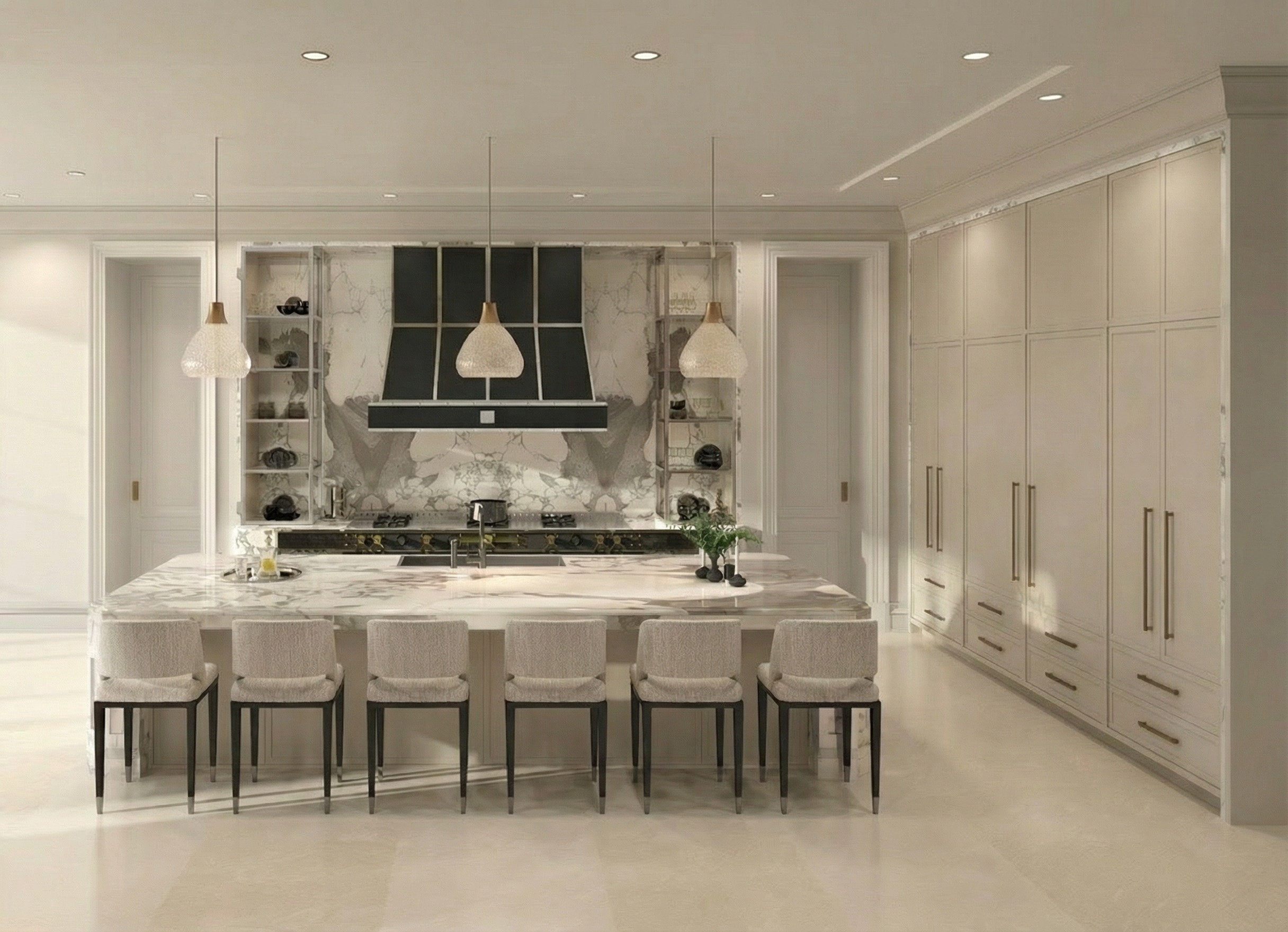 edit the existing kitchen render while preserving all original proportions lighting materials colors furniture and camera angle changes only do not add new elements change the range hood material to match the stone in the back make surface smooth satin elegant premium look